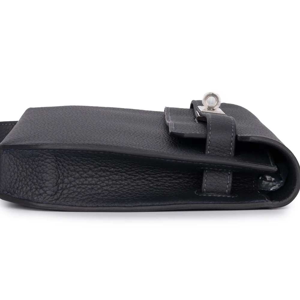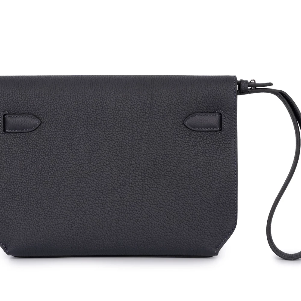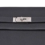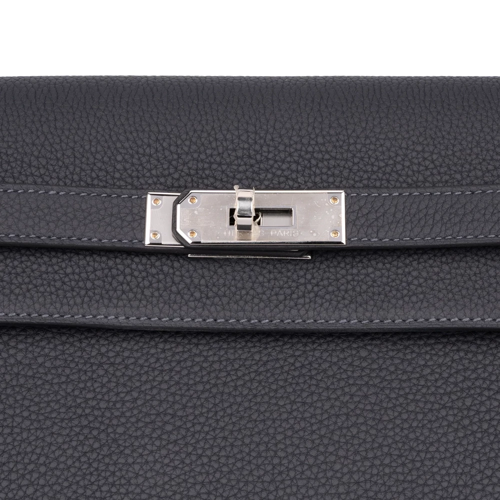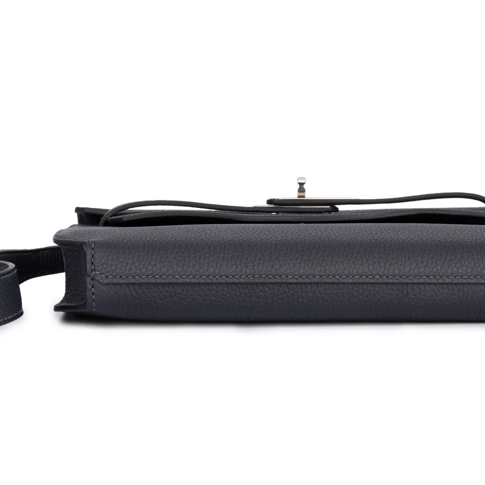 This Hermès Kelly 25 Depeches features Blue Navy calfskin for sleek, nautical polish. Palladium hardware accents the structured Sellier lines and angular clasp. The 25cm size fits tablets, planners, and essentials. Calfskin resists scratches and stays polished. Style with whites or gold jewelry for maritime contrast. Built for offices, yacht parties, or timeless errands. Classic authority.