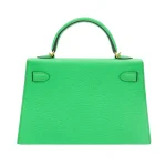 This Hermès style Kelly Mini features Vert Comic chèvre. Gold hardware warms the grassy green tone. The 20cm sellier design holds essentials neatly. Soft leather feels luxurious daily. Brightens neutral outfits with nature’s hue. Perfect for spring days or outdoor events. Fresh luxury for sunny spirits.