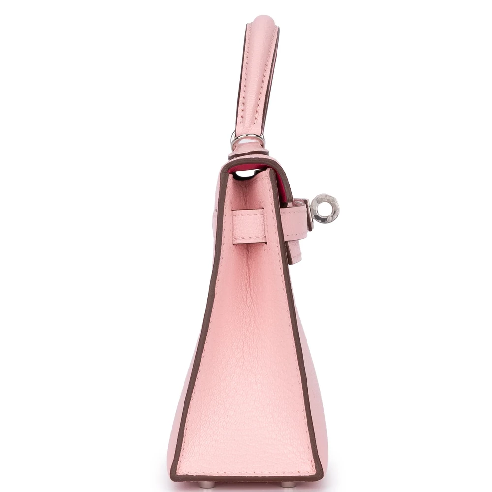 This Hermès Mini Kelly mixes Pink Sakura and Rose Mexico Chèvre leather for sweet two tone charm. Palladium hardware accents the compact Sellier design. The mini size fits lipsticks, cards, and small treasures. Chèvre leather stays lightweight and scratch resistant. Style with floral dresses or neutrals for playful elegance. Great for dates or weddings. Petite and charming.