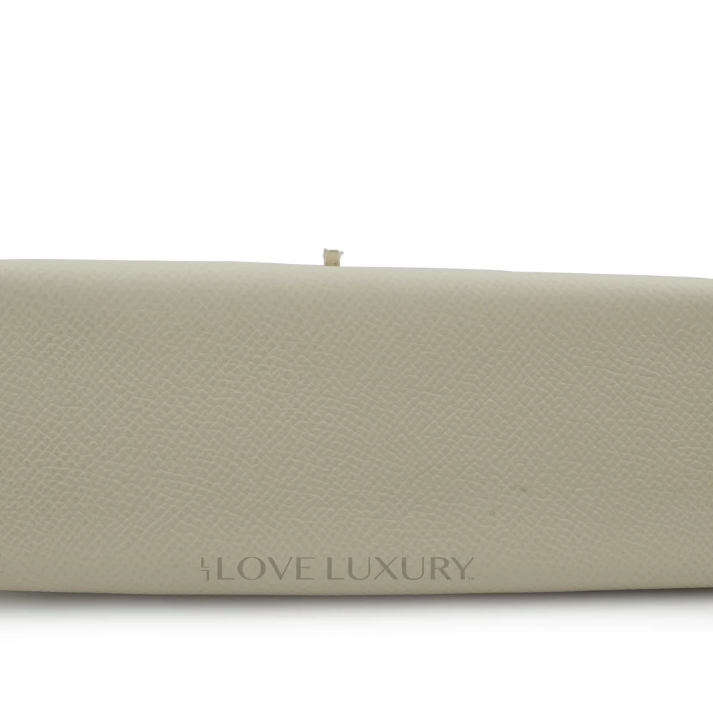 This Hermès Mini Kelly mixes Craie (chalk) and Gris Asphalt Epsom leathers for cool contrast. Permabrass hardware adds retro warmth. The mini size holds keys, cash, and small items. Epsom leather stays tough and easy to clean. Style with monochrome outfits for modern edge. Perfect for city days or minimalist events. Boldly understated.