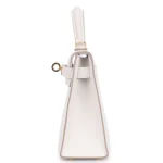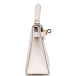 This Hermès Mini Kelly uses Gris Pale (soft grey) Epsom leather for minimalist polish. Gold hardware adds a touch of warmth to the compact design. The mini size fits lipsticks, cards, and small essentials. Epsom leather stays scratch free and structured. Pair with monochromes or metallics for modern elegance. Built for parties or special occasions. Tiny sophistication.
