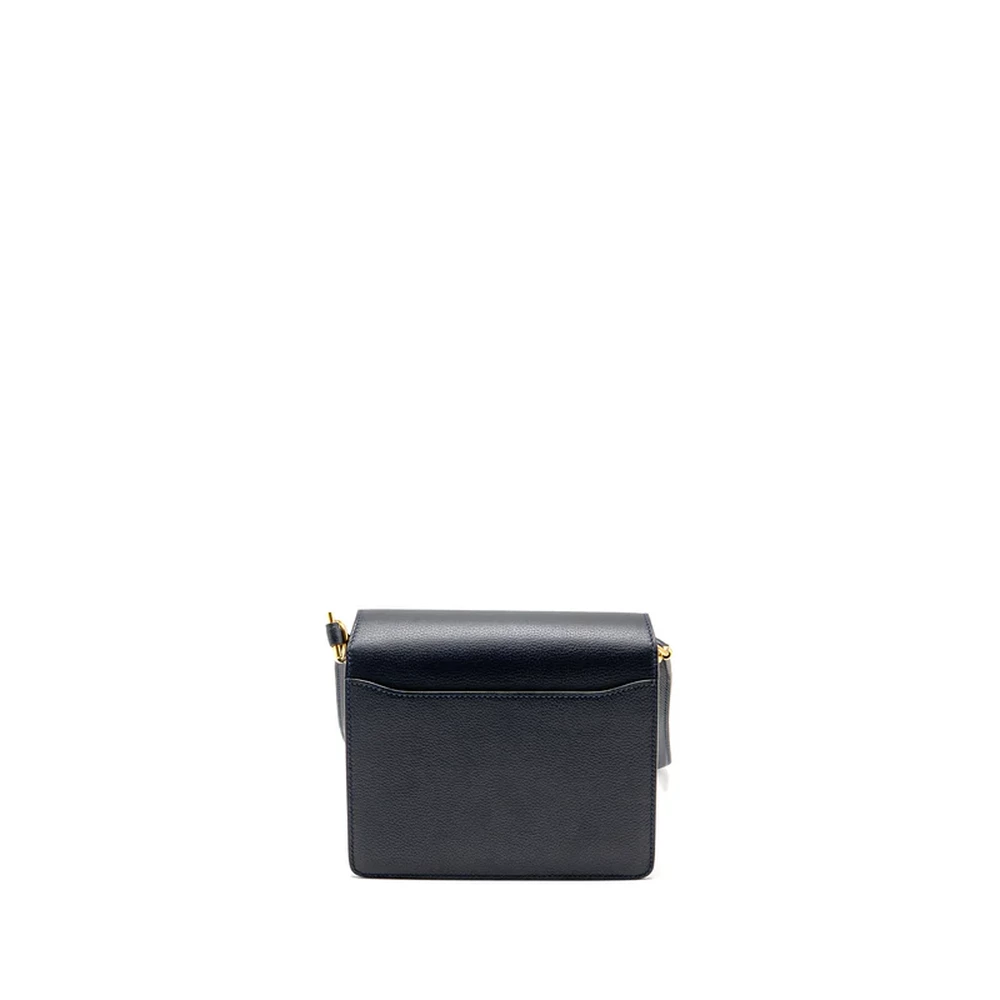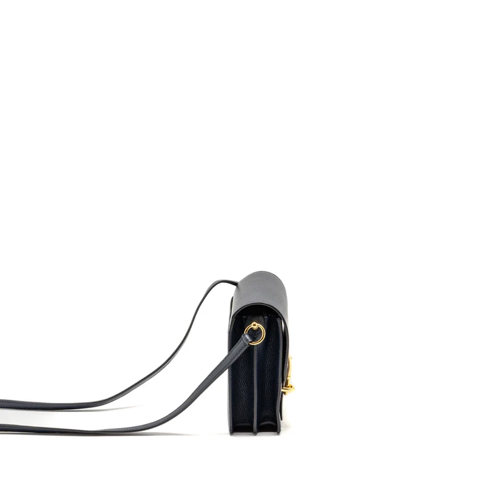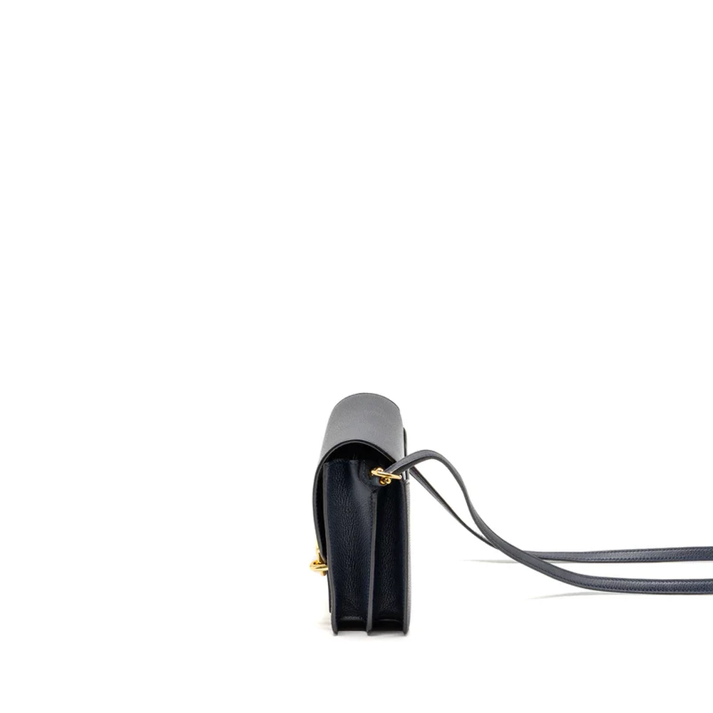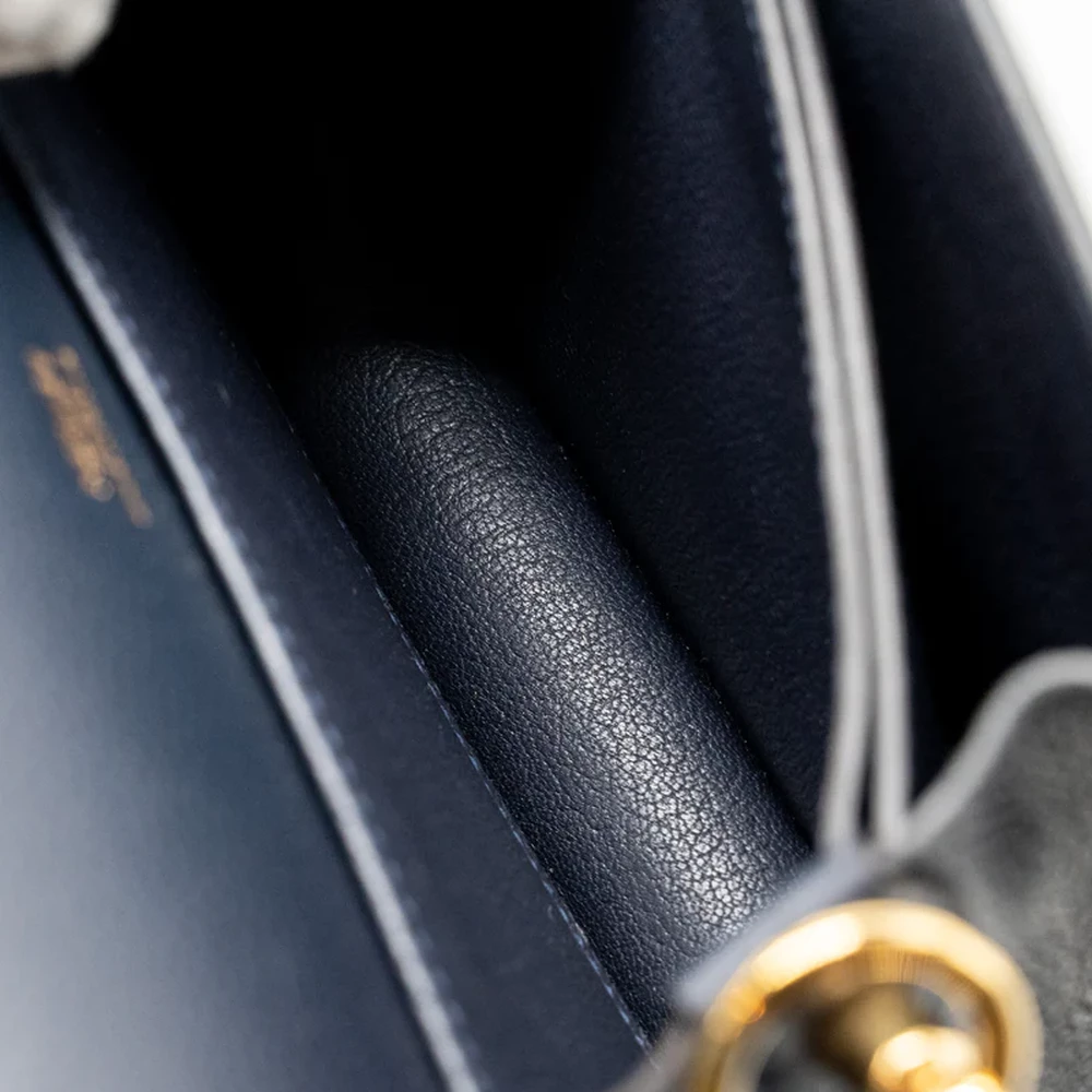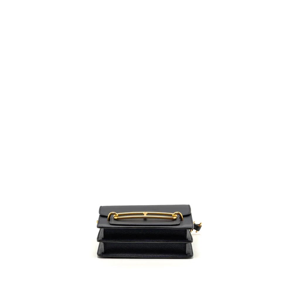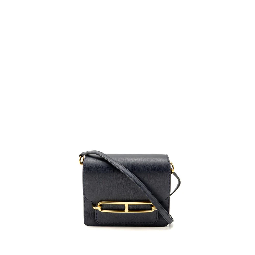 This Hermès Mini Roulis in Evercolor leather and Bleu Nuit with gold hardware offers a luxurious, deep blue hue. The rich, dark leather paired with the warm gold hardware creates a striking, elegant design. The compact size and smooth, structured shape make it a perfect accessory for day to night styling.