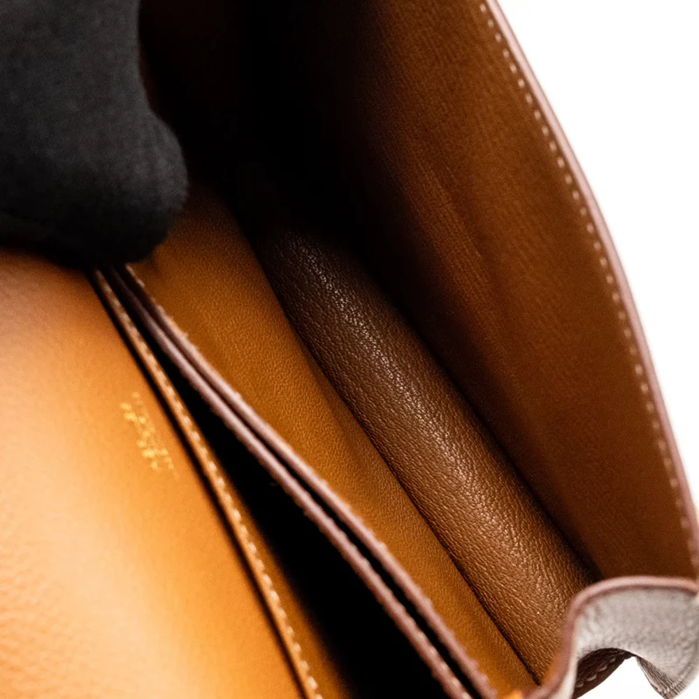 This Hermès Mini Roulis in Evercolor leather and Gold with gold hardware offers a luxurious and refined design. The rich gold leather paired with the warm gold hardware creates a sophisticated, elegant look, while the compact size makes it ideal for both day and night.