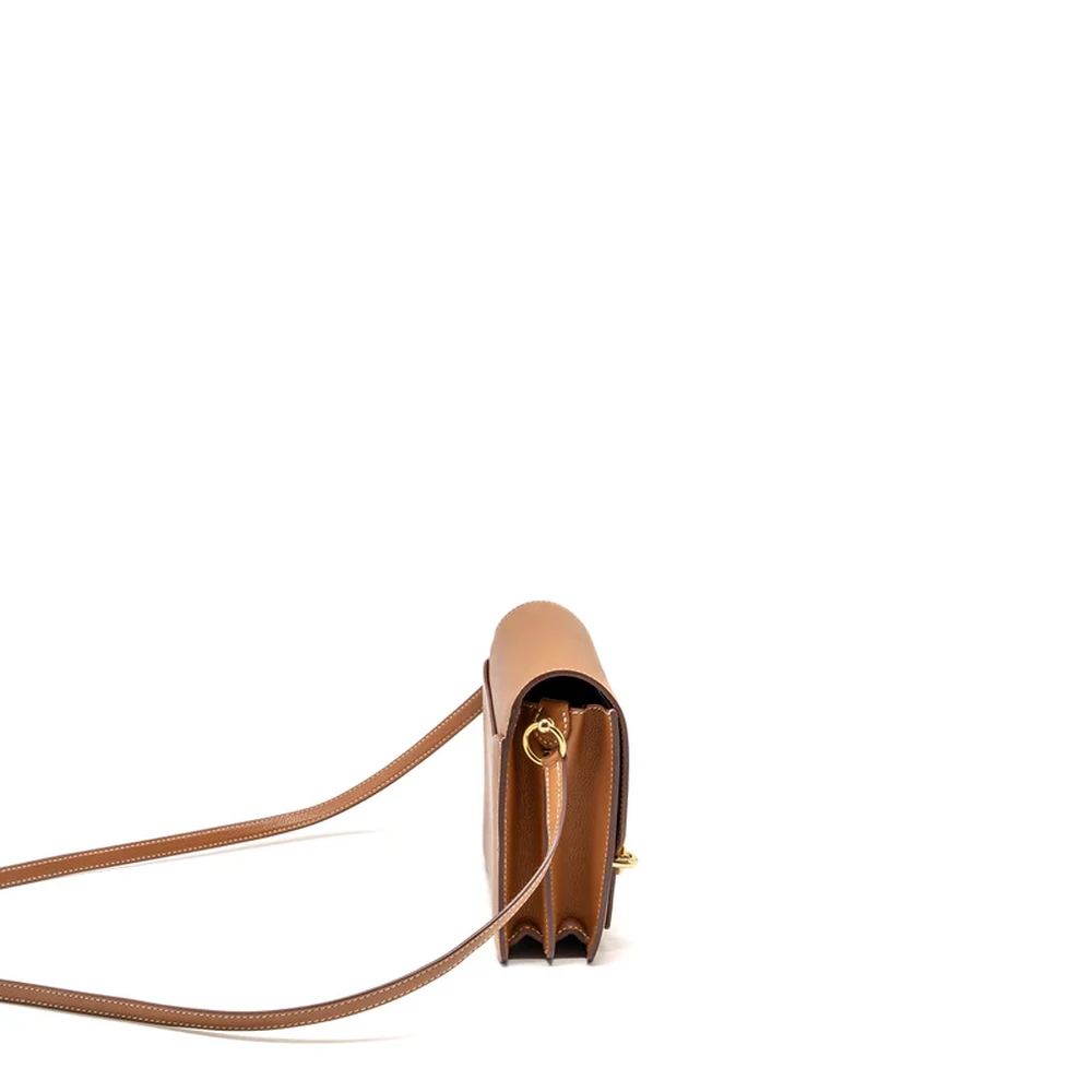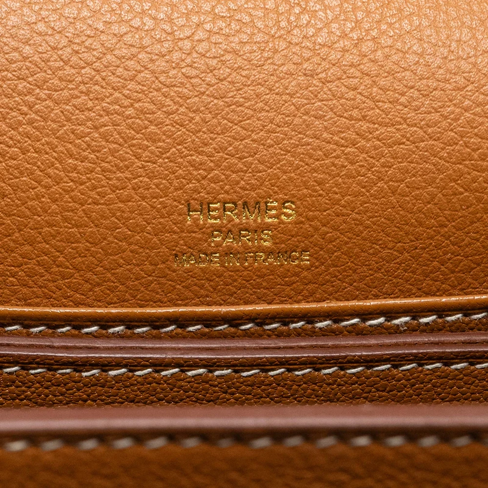 This Hermès Mini Roulis in Evercolor leather and Gold with gold hardware adds a touch of luxury to any outfit. The rich, warm leather paired with the shiny gold hardware creates an elegant and timeless design. Its small size and sleek, structured shape make it a chic and practical accessory for everyday use.