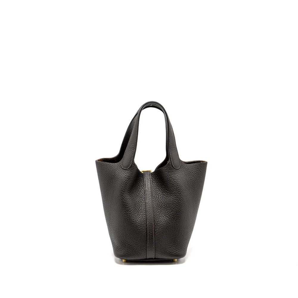 This Hermès Picotin 18 Lock Bag in Clemence leather in Ebene with Gold Hardware stamp Z is a luxurious and sophisticated design. The rich, deep Ebene color, paired with the soft Clemence leather, creates a timeless aesthetic. Gold hardware adds warmth, making it an elegant piece perfect for any occasion.