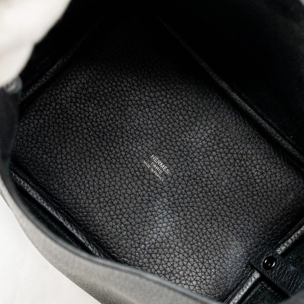 This Hermès Picotin 18 in Clemence leather in So Black with Silver Hardware stamp U offers a sleek and sophisticated design. The deep black Clemence leather creates a timeless, elegant look, while the silver hardware enhances its refined aesthetic. It’s a versatile piece that works well for any occasion.