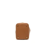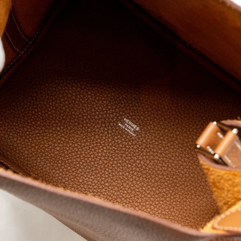 This Hermès Picotin 22 Lock Bag in Clemence leather in Gold with Silver Hardware stamp C offers a refined and luxurious design. The soft Gold color paired with Clemence leather creates a sophisticated look, while silver hardware adds a modern touch. The lock closure adds an extra element of security and elegance.