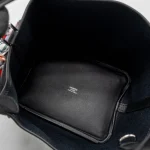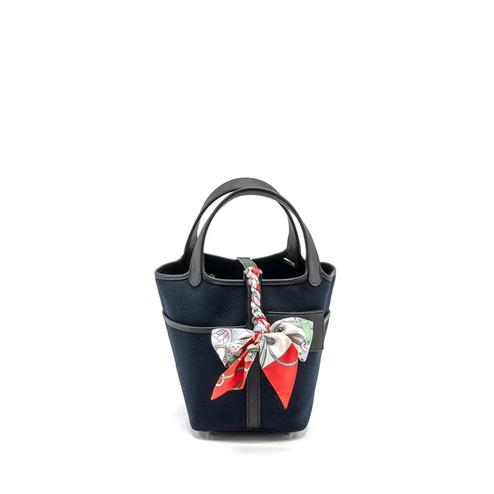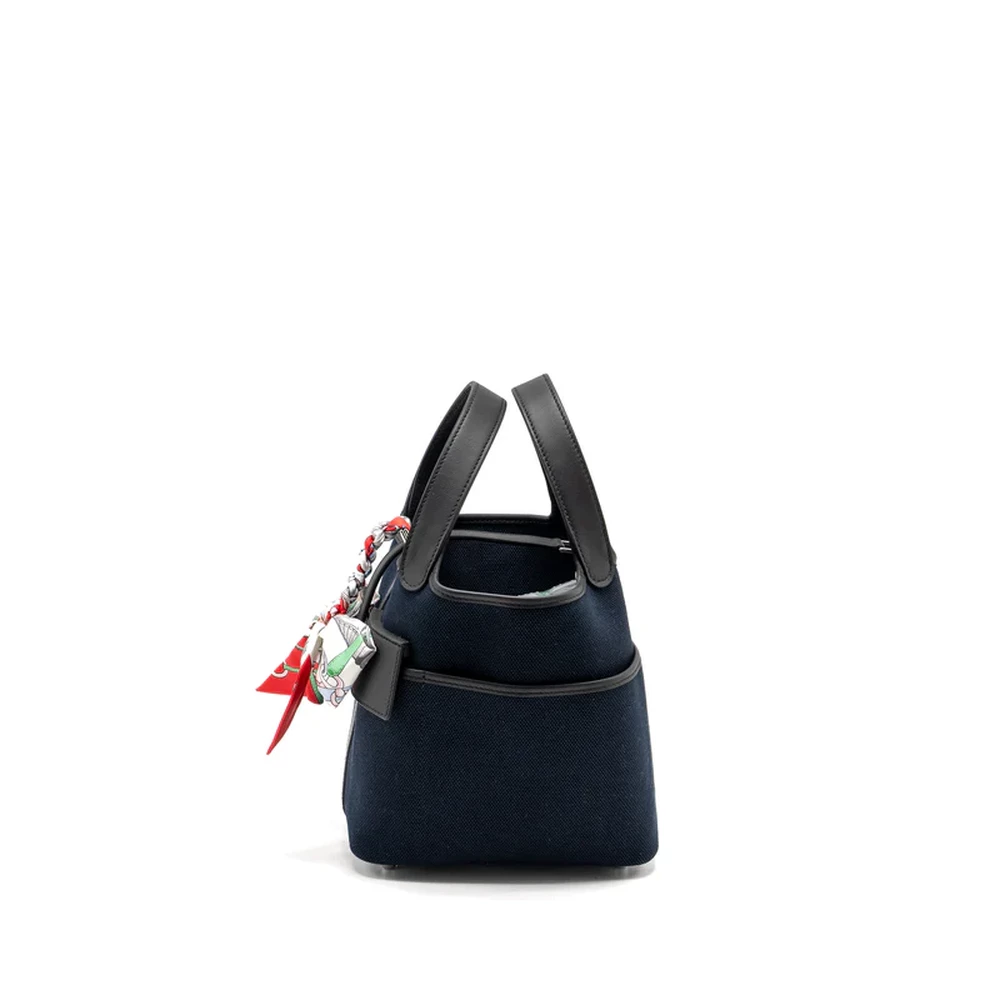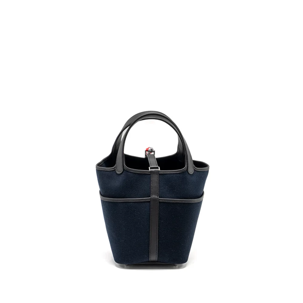 This Hermès Cargo Picotin 18 Lock Bag in Canvas and Swift leather in Bleu Marine Black with Silver Hardware stamp U combines classic elegance with a contemporary design. The deep blue hues of the leather and canvas are complemented by the silver hardware, creating a stylish, functional bag perfect for both casual and formal looks.