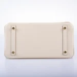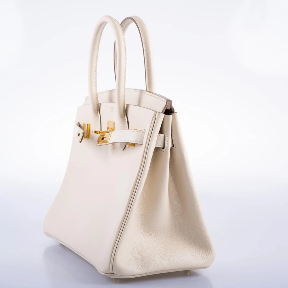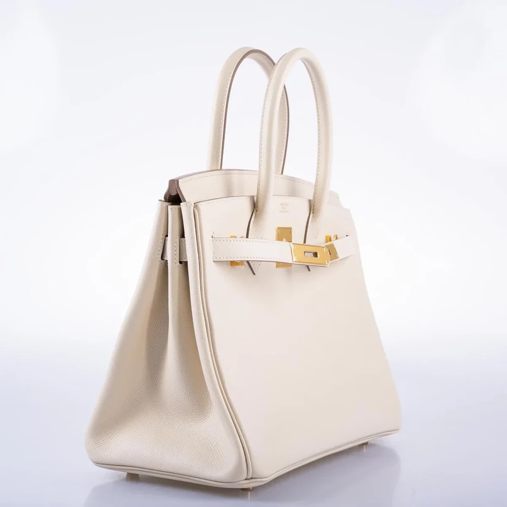 This Hermès style Birkin 30 glows in Craie Epsom leather, a crisp ivory white tone. Gold hardware adds warmth to the 30cm structured design. Stiff Epsom leather stays scratch resistant and polished. Roomy enough for work files or weekend essentials. Pair with brights or neutrals for versatility. Timeless elegance for every season.