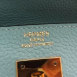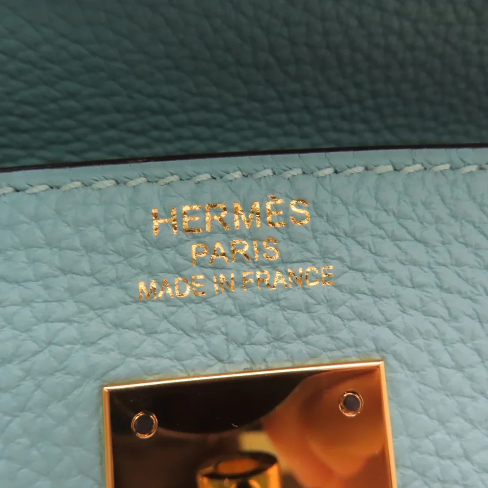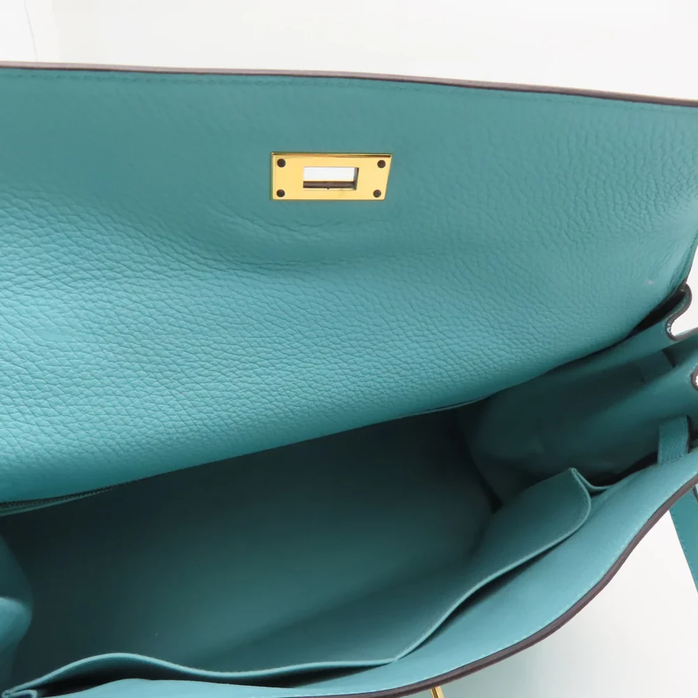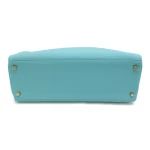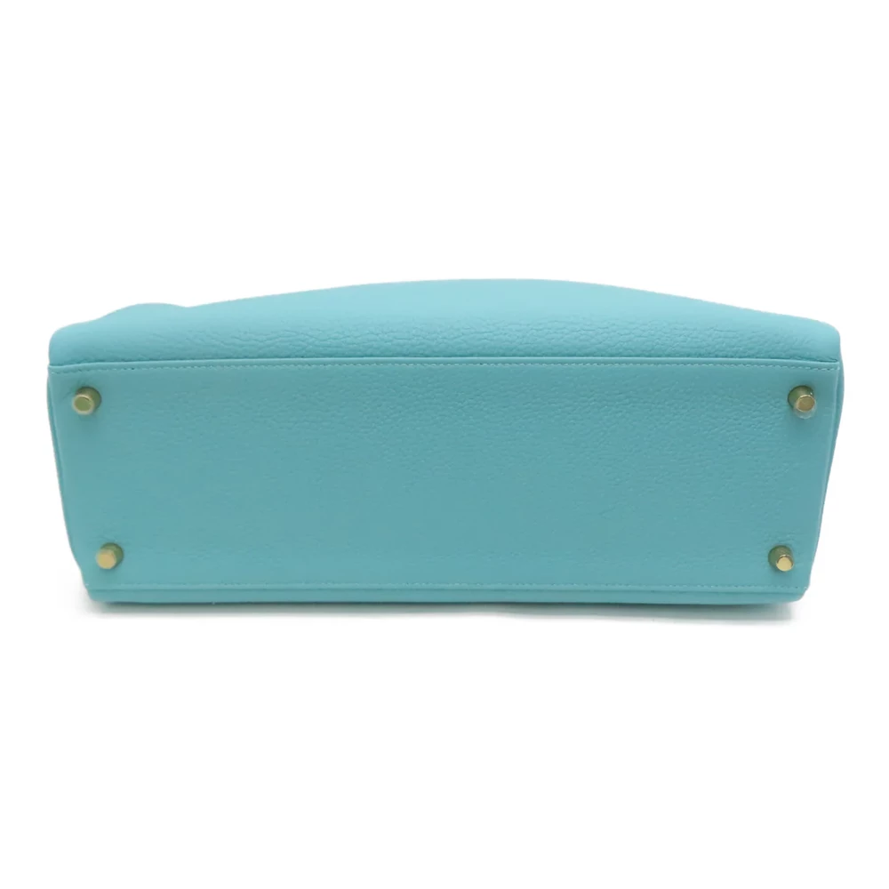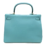 This Hermès inspired Kelly 32 features Lagoon Clemence leather for tropical turquoise vibrancy. Palladium hardware complements the relaxed, slouchy shape. The 32cm size holds beach towels, tablets, and travel kits. Clemence leather resists wear and softens over time. Pair with white linens or gold jewelry for coastal ease. Made for resorts, weekends, or summer escapes. Oceanic luxury.