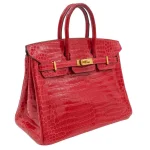 This Hermès inspired Birkin 25 dazzles in Braise shiny Niloticus crocodile leather, a fiery red. Gold hardware amplifies the glossy 25cm design’s opulence. Scratch resistant crocodile stays flawless for years. Compact yet fits essentials like lipstick and cards. Pair with black for evening drama. A red carpet statement in miniature.