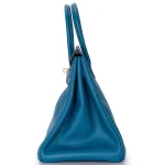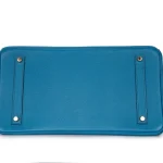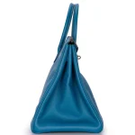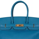This Hermès inspired Birkin 35 Retourne features Epsom Blue Izmir leather for a vibrant, jewel toned look. Gold hardware adds warmth to the slouchy, relaxed silhouette. The 35cm size fits laptops, books, and travel essentials. Epsom leather resists scratches and stays polished. Pair with neutrals or metallics for striking contrast. Ideal for work, travel, or special occasions. Bold elegance made practical.