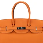 This Hermès inspired Birkin 35 Retourne features Togo Orange leather for bold, citrusy energy. Palladium hardware cools the slouchy, spacious silhouette. The 35cm size fits laptops, snacks, or weekend essentials. Togo leather resists scratches and stays soft. Pair with denim or white for vibrant pop. Perfect for festivals, travel, or summer adventures. Joy in every stitch.