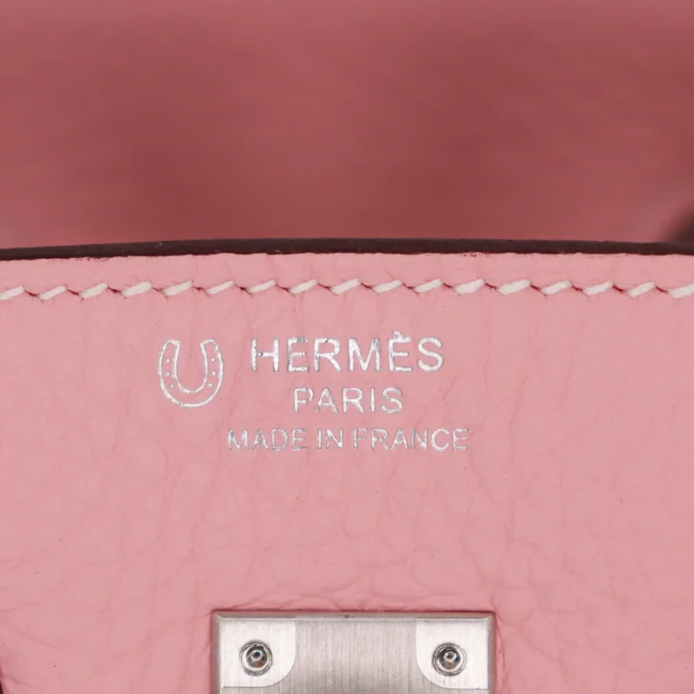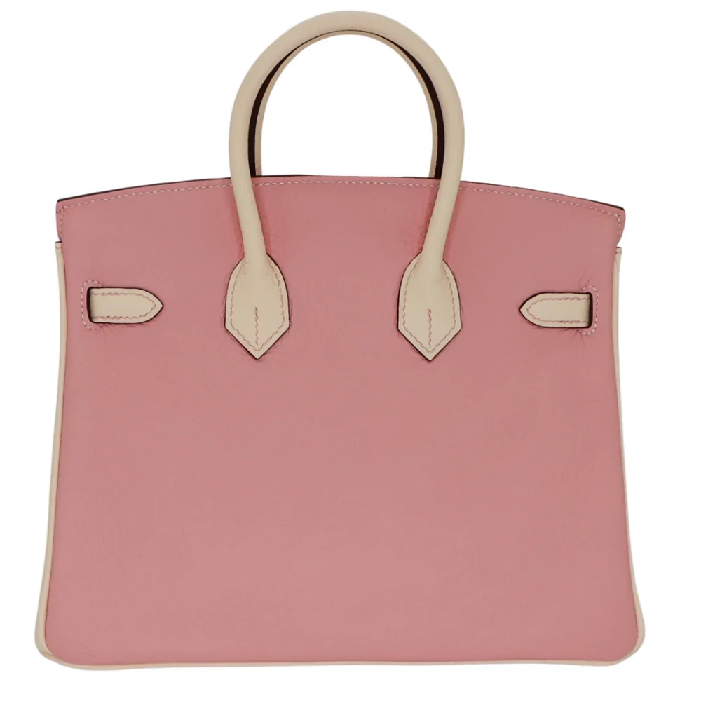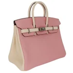 This Hermès inspired Birkin 25 mixes pink and cream Clemence leather. The brushed silver hardware keeps the look soft and subtle. The 25cm size is lightweight and easy to carry. The leather feels cozy against your arm, like a favorite sweater. It’s perfect for brunch dates or shopping trips. The gentle colors add warmth to any outfit. A bag that’s as sweet as a summer day.