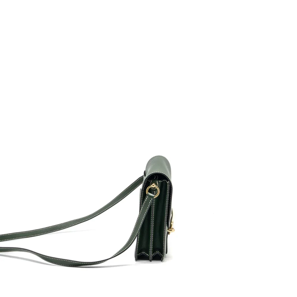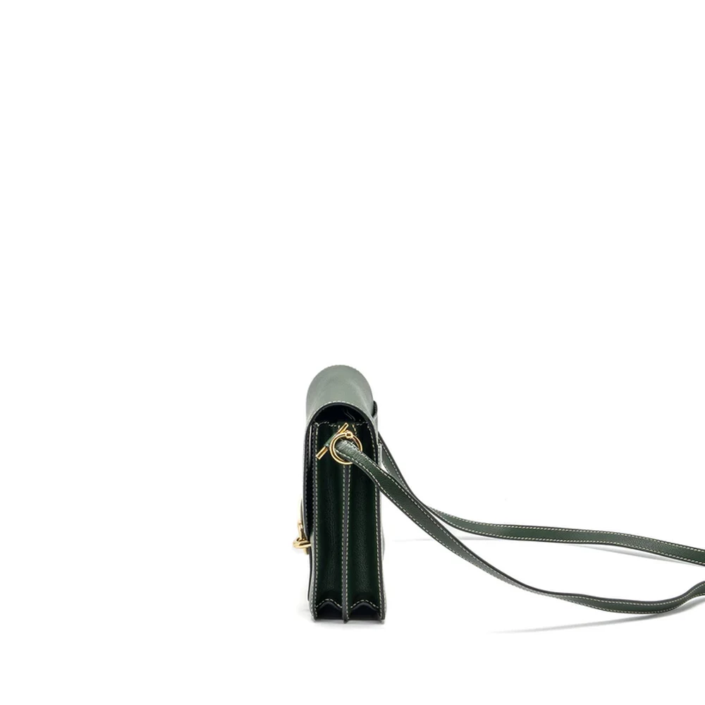 This Hermès Roulis 23 in Evercolor leather in Dark Green with Gold Hardware stamp X offers a luxurious and sophisticated design. The deep Dark Green color, paired with the smooth Evercolor leather, creates a refined and elegant aesthetic. Gold hardware adds warmth, making it a chic piece for any occasion.