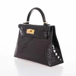 This Hermès inspired Kelly II Sellier Mini dazzles in Black Shiny Crocodile leather for sleek, exotic allure. Gold hardware accents the crisp Sellier lines and compact frame. The mini size holds phones, keys, and cosmetics. Crocodile leather is durable and luxuriously glossy. Pair with evening wear or tailored suits for timeless contrast. Ideal for galas, dinners, or collector’s displays. Opulence perfected.