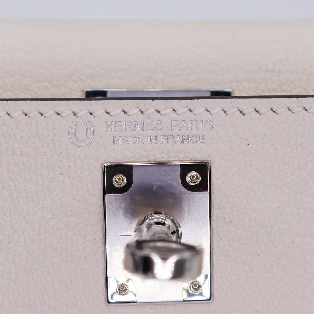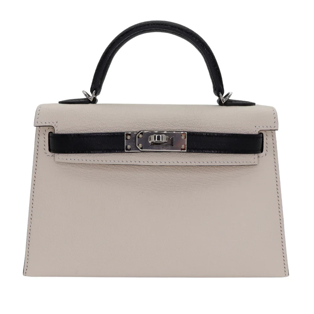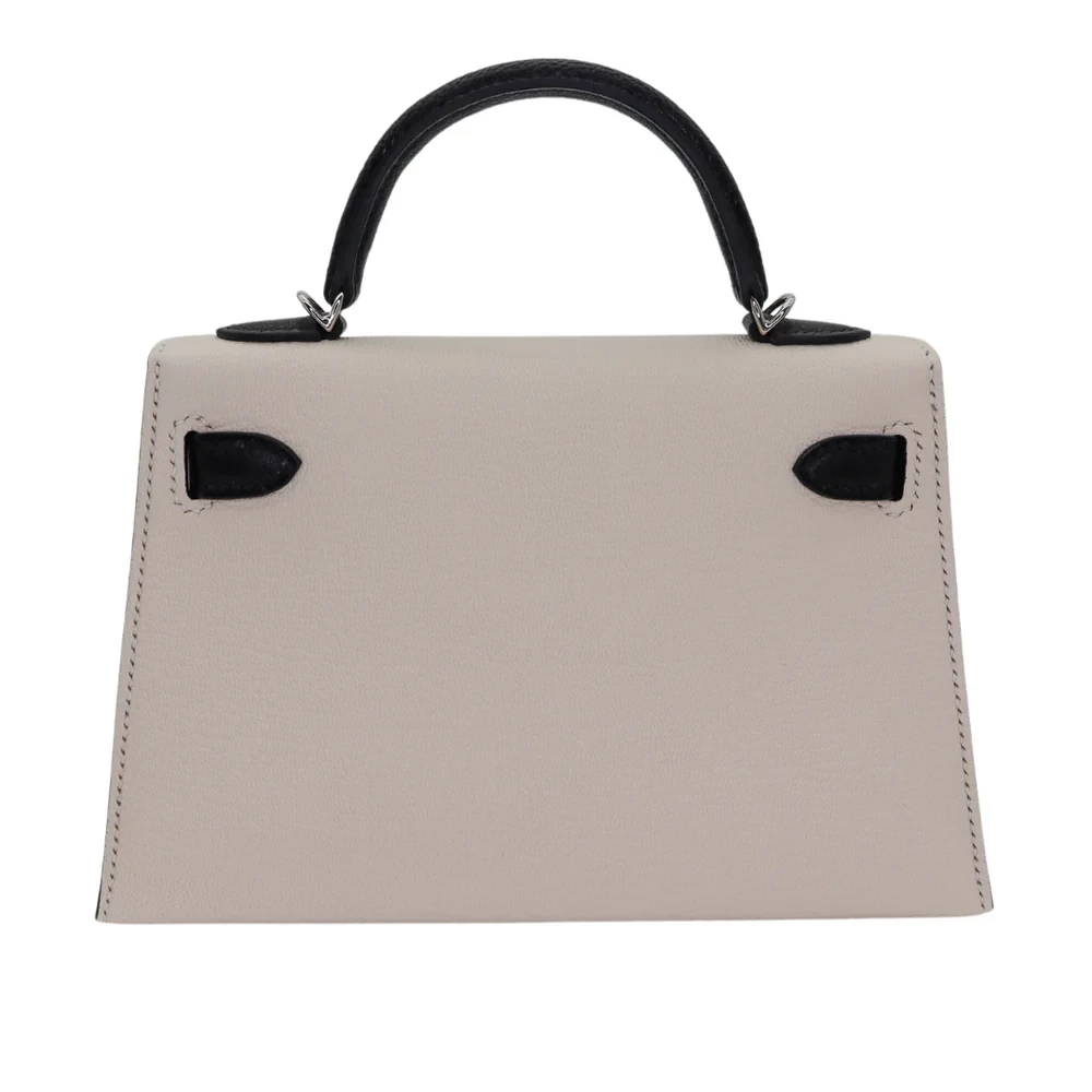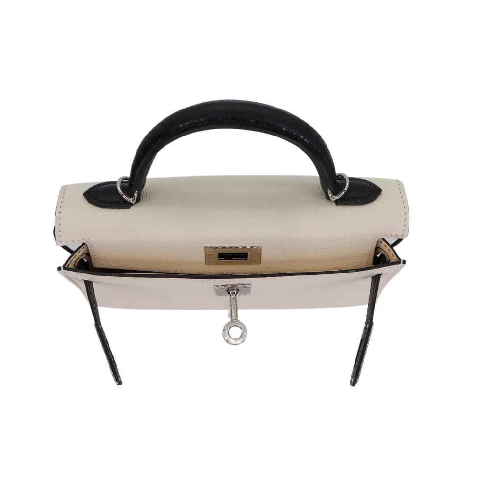 This Hermès style Kelly Mini mixes Nata/Black chèvre. Palladium hardware creates modern contrast. The 20cm size fits essentials neatly. Two tone design adds visual interest. Perfect for day to night versatility. Yin yang elegance in miniature.