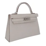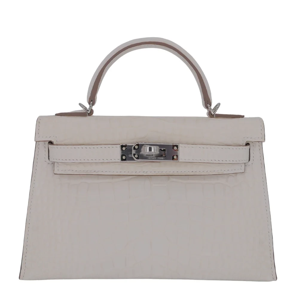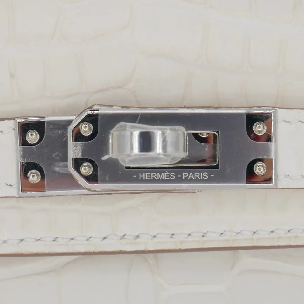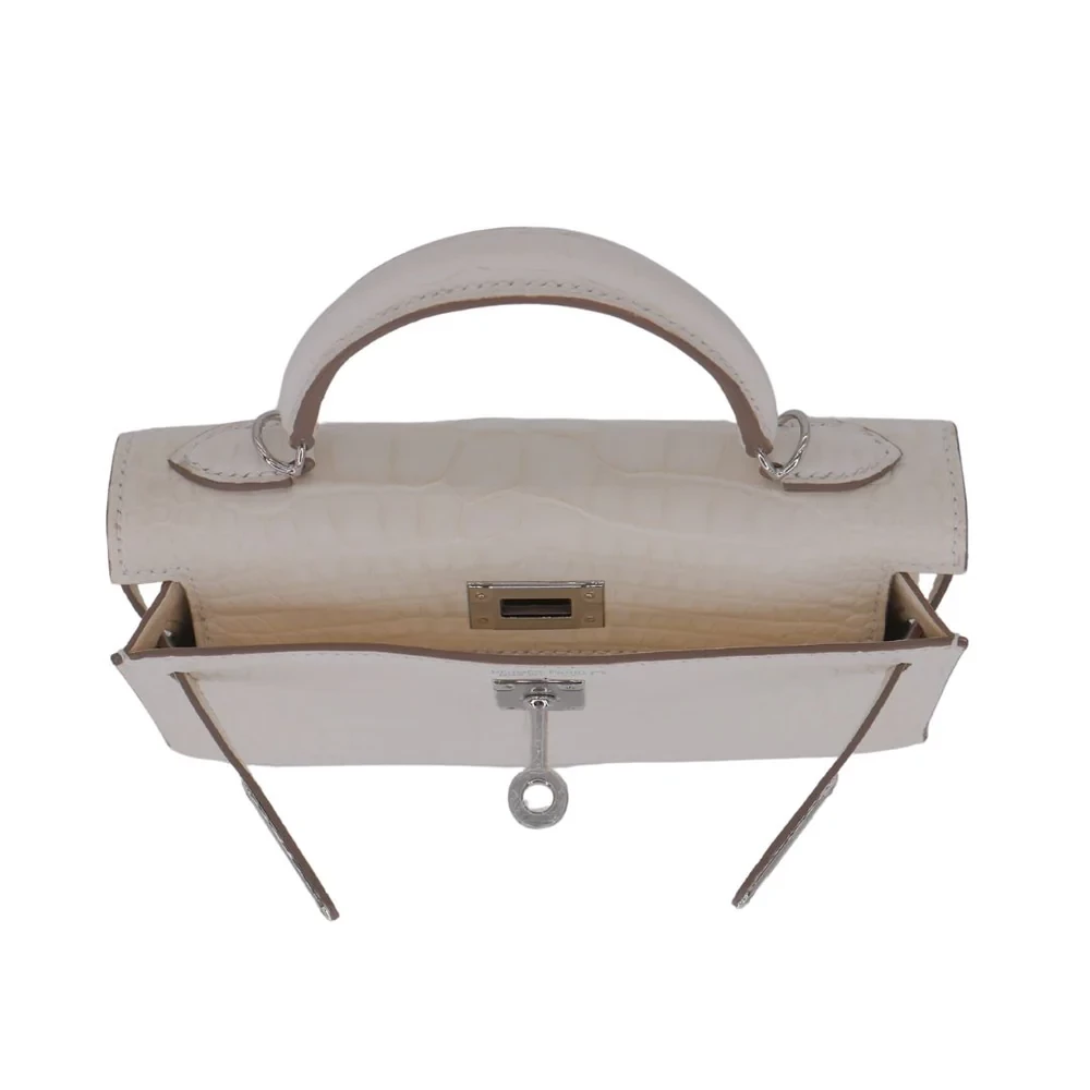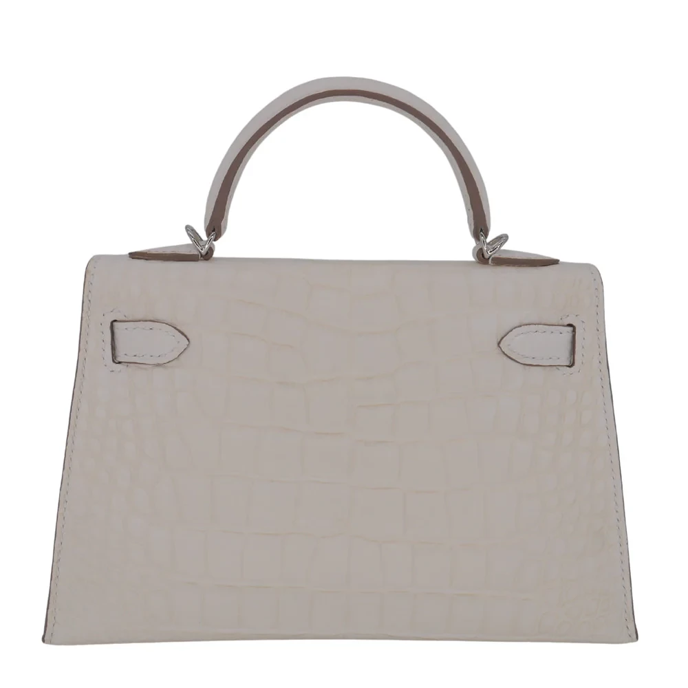 This Hermès inspired Kelly II Sellier Mini features Nata Boreal matte alligator leather in soft, icy tones. Palladium hardware contrasts the structured Sellier lines and compact design. The mini size fits keys, cards, and lipsticks. Matte alligator resists scratches and stays understated. Pair with winter whites or silver jewelry for frosty elegance. Perfect for ski trips, holidays, or minimalist glamour. Arctic allure, perfected.