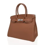 This Hermès inspired Birkin 30 Touch pairs Gold Togo leather with matte alligator for sunlit luxury. Palladium hardware cools the warm metallic tones. The 30cm size carries bulkier items like sweaters or files. Togo hides scuffs; matte alligator stays sleek. Pair with earth tones or jewel hues for radiant contrast. Limited edition flair for collectors or trendsetters. Gilded rarity.