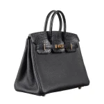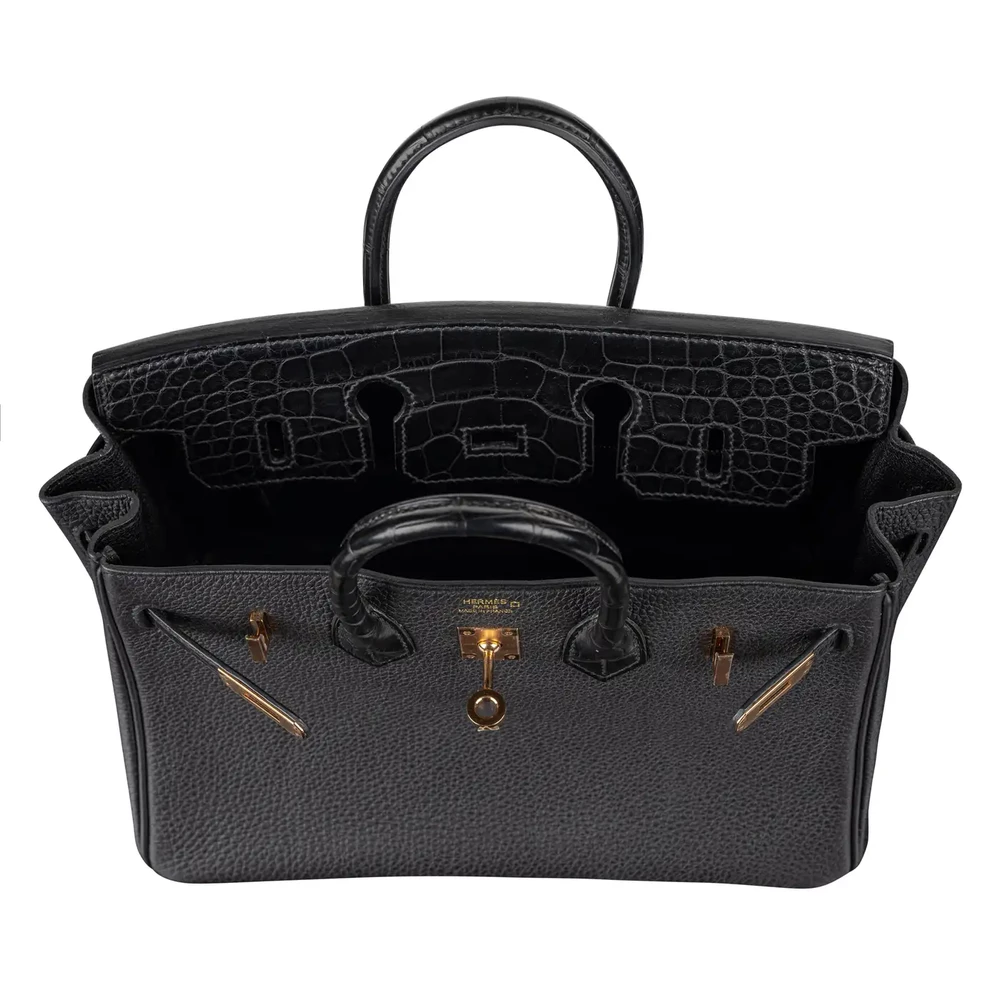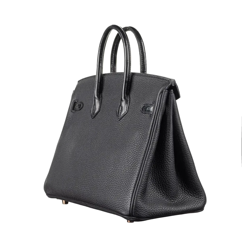 This Hermès inspired Birkin 25 Touch contrasts Black Togo leather with glossy alligator for stealthy glam. Rose gold hardware adds a romantic twist to the structured design. The 25cm size holds tablets, keys, and lipsticks. Togo and alligator stay scratch free and luxe. Pair with blush tones or metallics for edgy romance. Built for dates, dinners, or bold errands. Shadowy opulence.