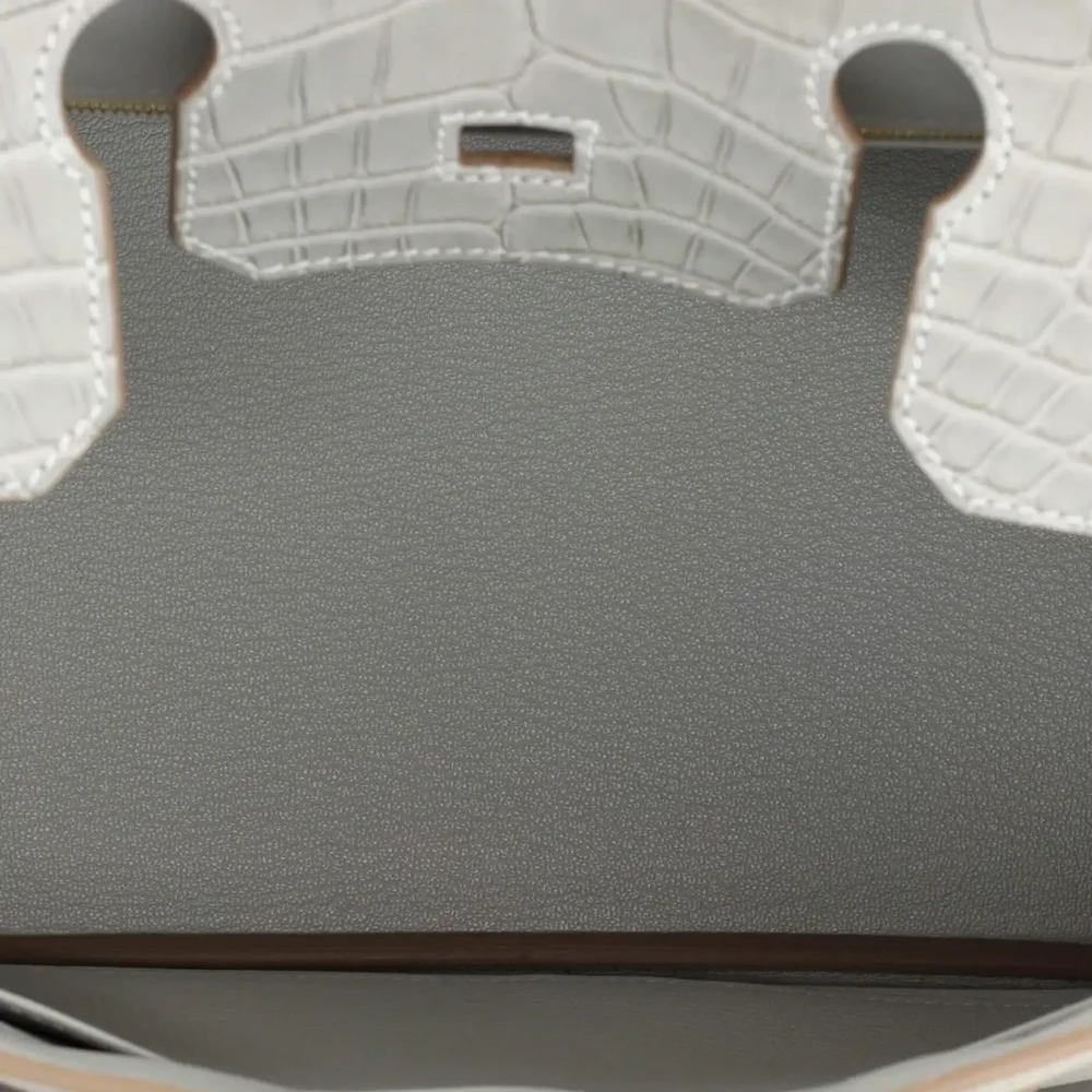 This Hermès inspired Birkin 30 Touch layers Grey Togo leather with matte alligator for urban edge. Gold hardware warms the cool, neutral palette. The 30cm size fits laptops, scarves, or gym gear. Togo and alligator resist scratches and stay sleek. Pair with metallics or pastels for modern contrast. Built for city life, offices, or minimalist wardrobes. Concrete elegance.