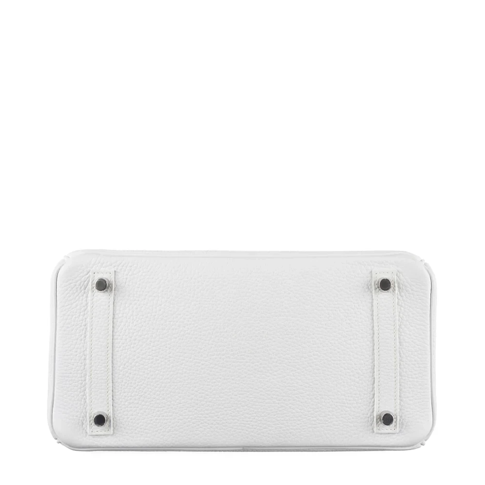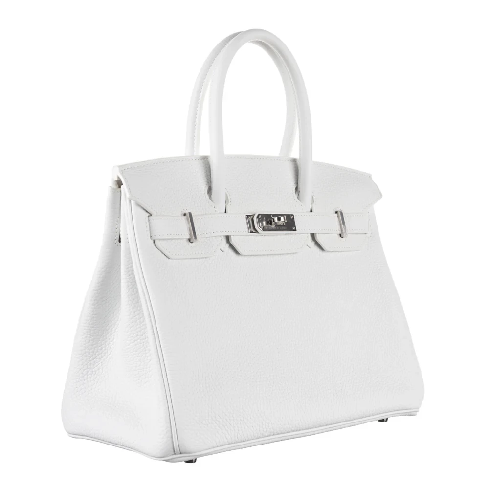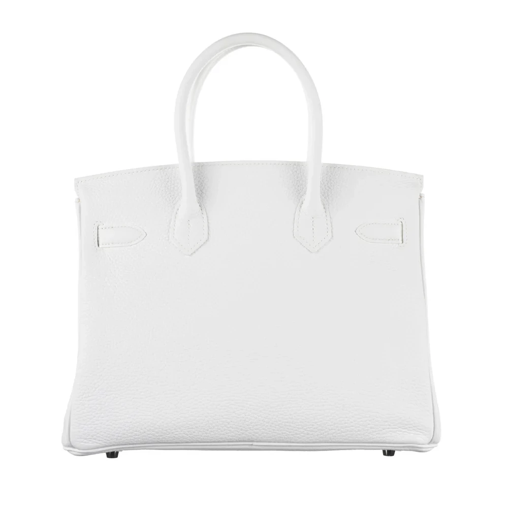 This Hermès style Birkin 30 shines in White Clemence leather for crisp, minimalist elegance. Palladium hardware adds modern contrast to the 30cm design. Supple Clemence leather resists scratches and stays lightweight. Roomy enough for daily essentials or gym gear. Pair with pastels or brights for clean contrast. A blank canvas for endless style.