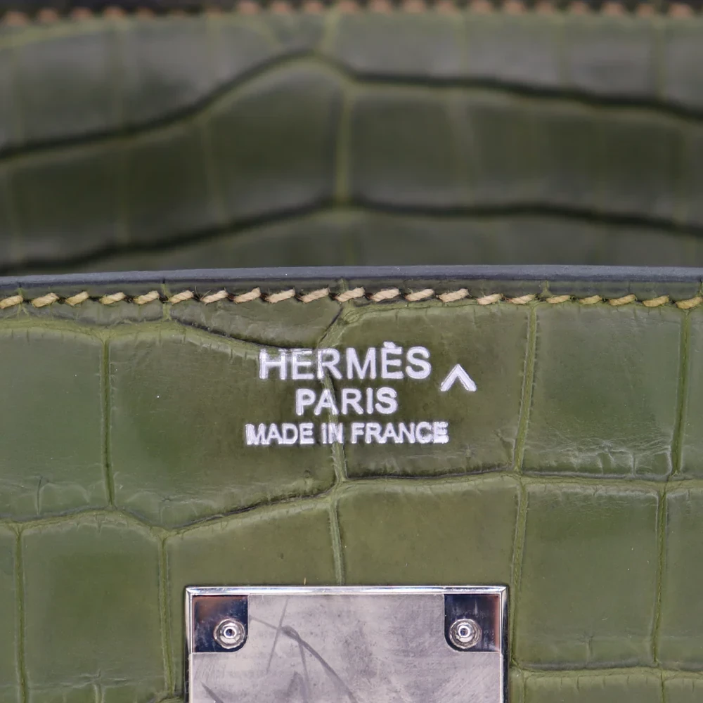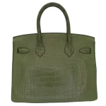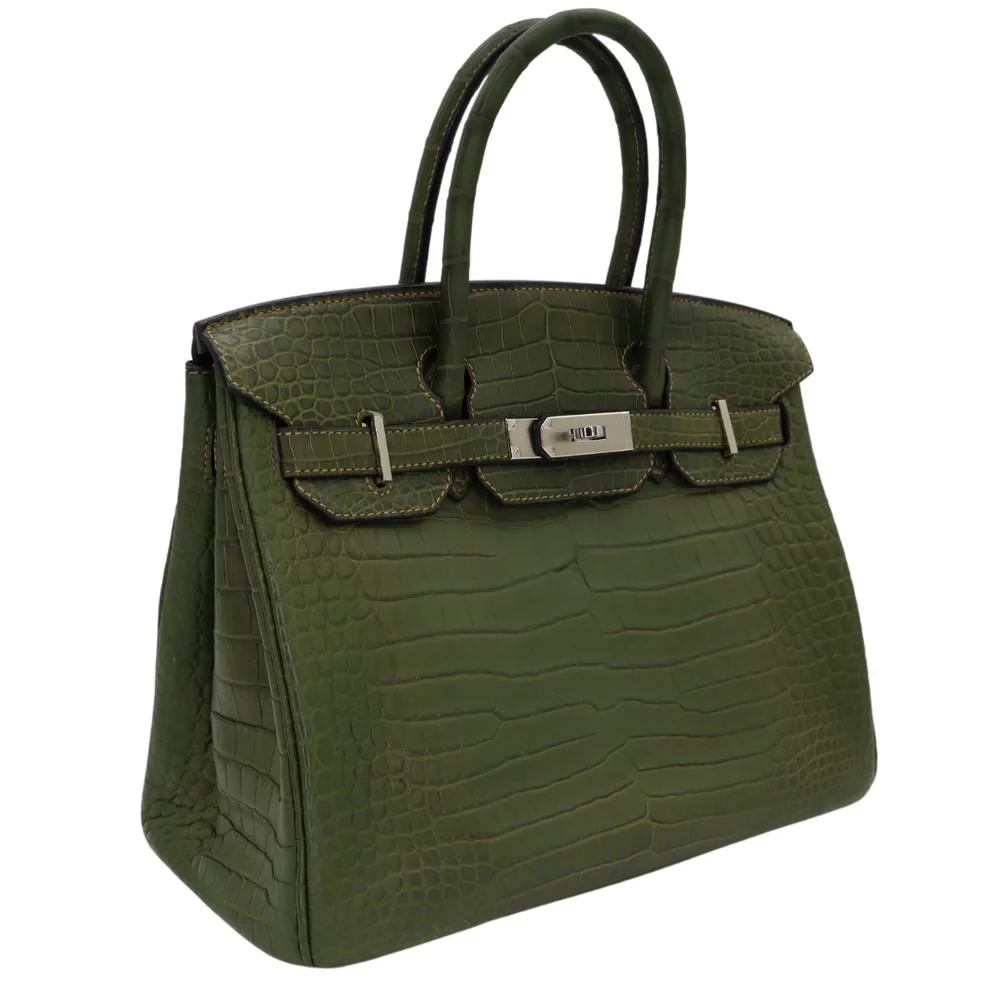 This Hermès style Birkin 30 glows in sage green matte crocodile leather. The silver palladium hardware adds a cool contrast. The 30cm size is spacious yet lightweight. The earthy color pairs with neutrals or prints. Perfect for nature lovers or office wear. A bag that’s both calm and confident.