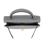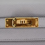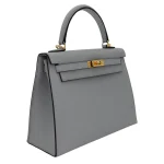 This Hermès Inspired Kelly 25 features Bleu Glacier Epsom leather. Gold hardware enhances the icy blue. The sellier style maintains crisp structure. Epsom leather resists stains. Perfect with silver and white outfits. Your perfect winter wedding companion. Cool luxury for special moments.