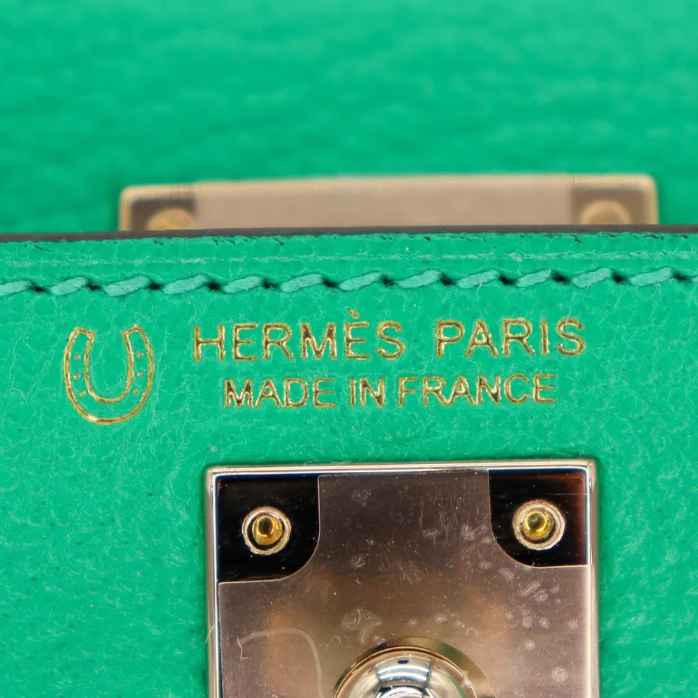 This Hermès inspired Kelly II Sellier Mini combines Menthe and Mauve Pale Chèvre leather for soft contrast. Permabrass hardware accents the HSS panel and compact Sellier shape. The mini size fits lipsticks, cards, and small items. Chèvre leather stays lightweight and scratch resistant. Pair with pastels or metallics for whimsical charm. Perfect for garden parties, brunch, or spring events. Playful sophistication, mastered.