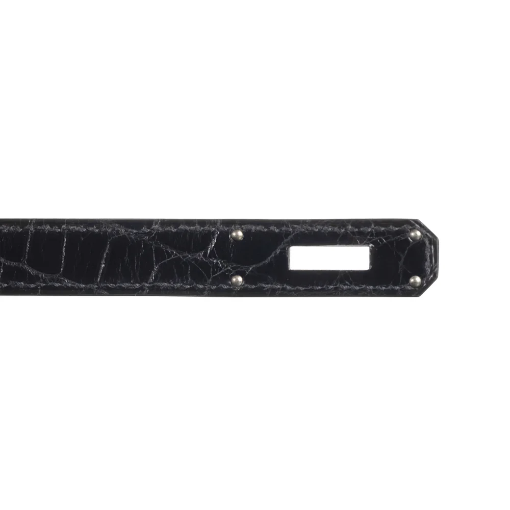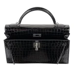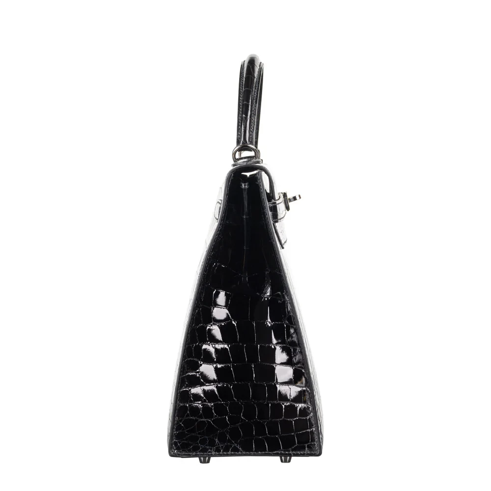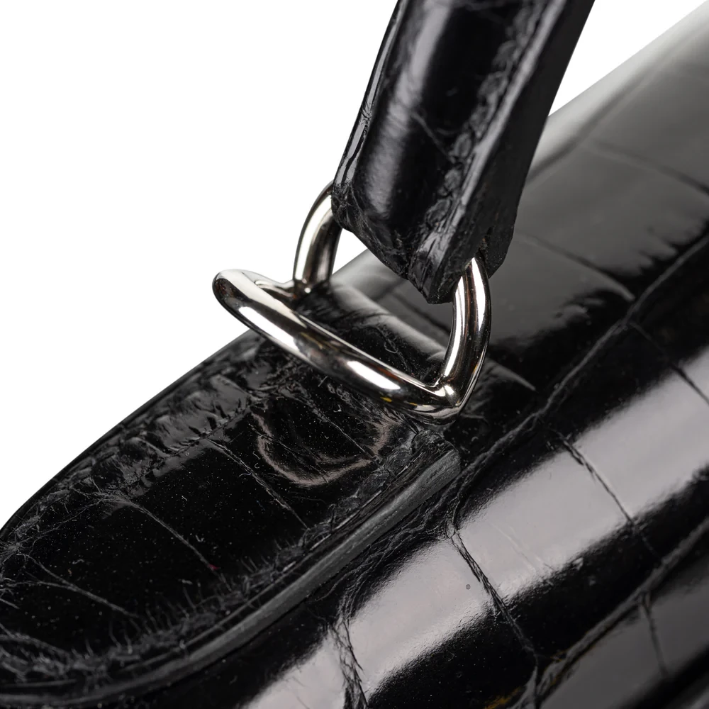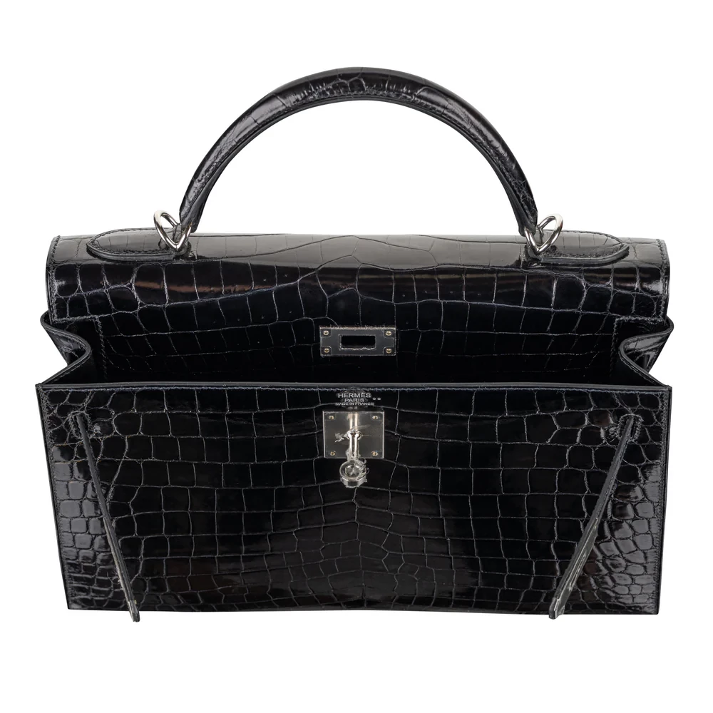 This Hermès inspired Kelly 32 uses Black Shiny Niloticus crocodile. Palladium hardware enhances the stealthy finish. The 32cm sellier design holds work files and travel gear. Glossy leather resists scratches and rain. Makes a statement with minimalist outfits. Your perfect power bag for executives. Commanding luxury for boardroom leaders.