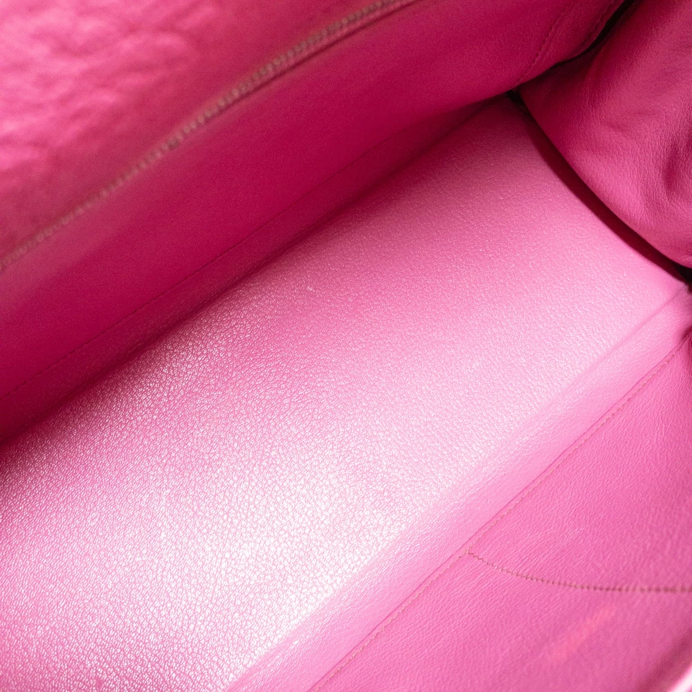 This Hermès inspired Kelly 32 dazzles in Rose Shocking Chèvre leather for electric pink boldness. Palladium hardware accents the slouchy retourne silhouette. The 32cm spacious interior fits gym gear, tablets, and more. Chèvre leather stays lightweight and scratch resistant. Pair with monochromes or leather for head turning pop. Built for fashion weeks, festivals, or fearless style. Audacious elegance.