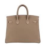 This Hermès inspired Birkin 25 glows in Etoupe Togo leather, a warm grey beige hue. Gold hardware adds subtle contrast to the 25cm design. Soft Togo leather resists scratches and ages gracefully. Compact yet fits essentials like cards and keys. Pair with pastels or metallics for versatility. Timeless sophistication for daily use.