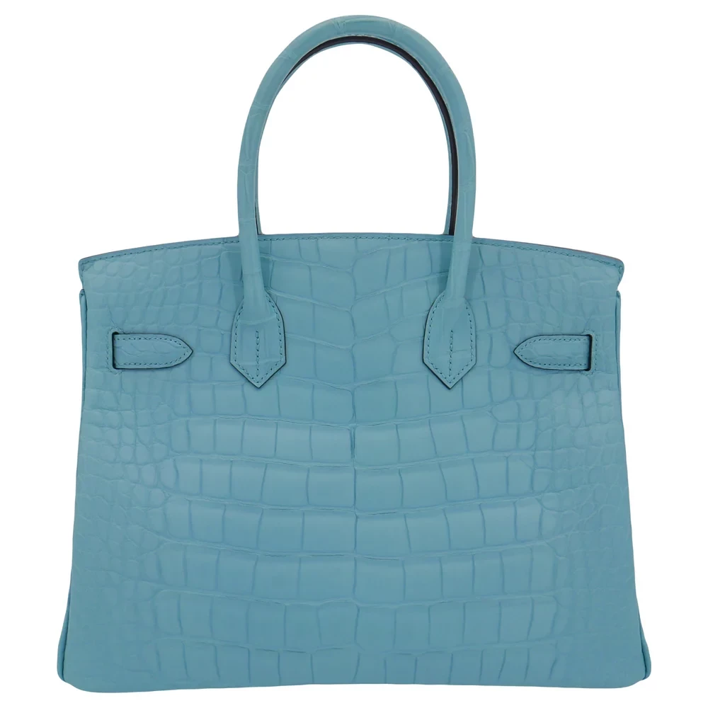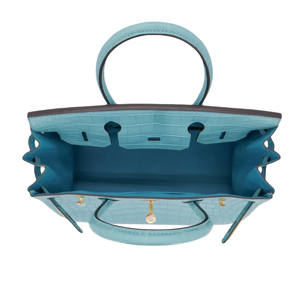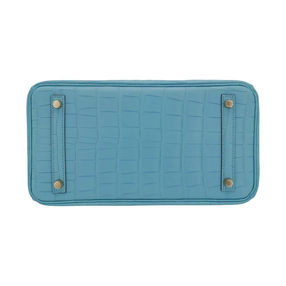 This Hermès inspired Birkin 30 features Bleu Saint Cyr matte alligator leather for a deep, muted navy finish. Gold hardware adds warmth to the 30cm structured design. Matte alligator resists scratches while maintaining refined texture. Roomy enough for work essentials or weekend gear. Pair with neutrals or metallics for timeless contrast. Perfect for city nights or office days. Understated maritime elegance.