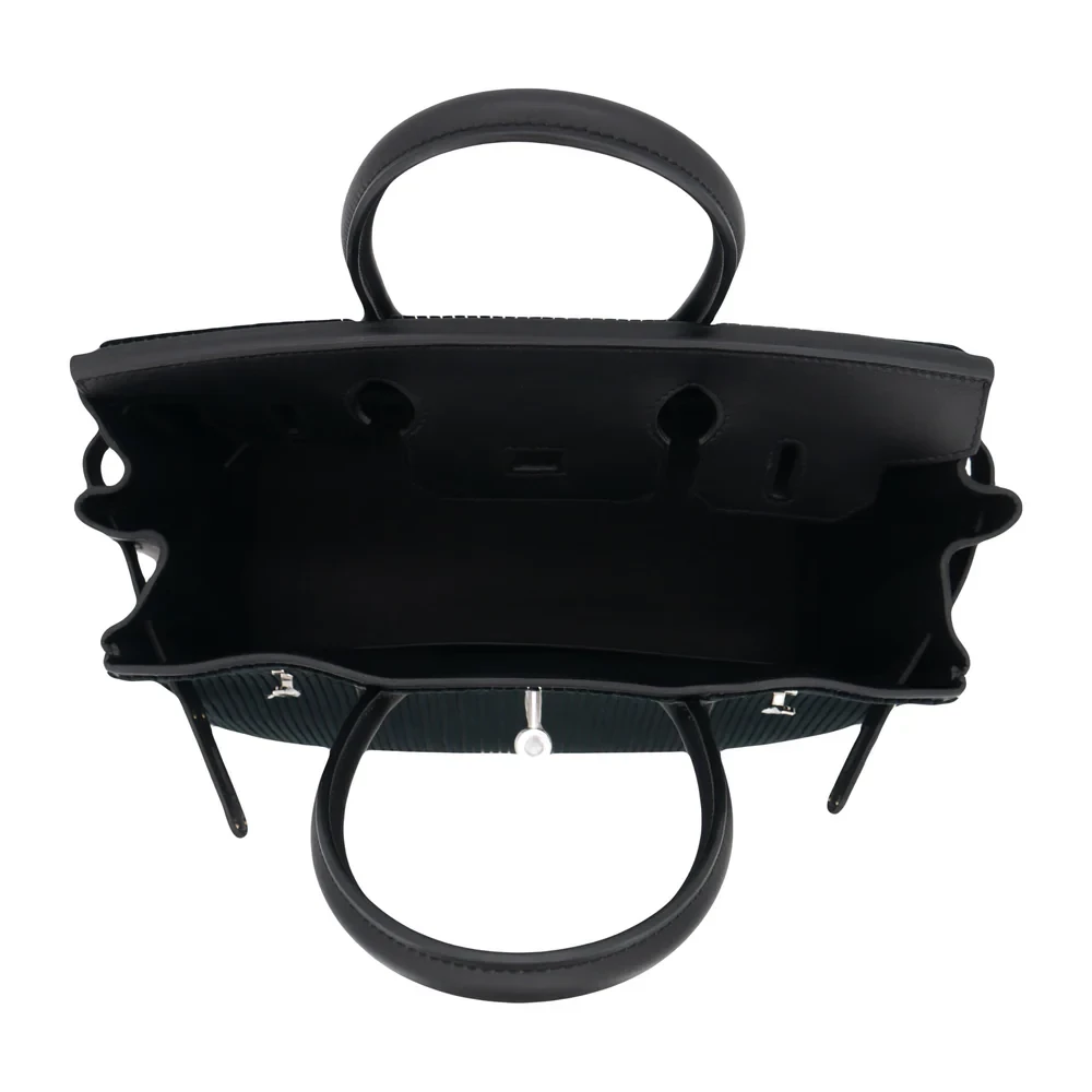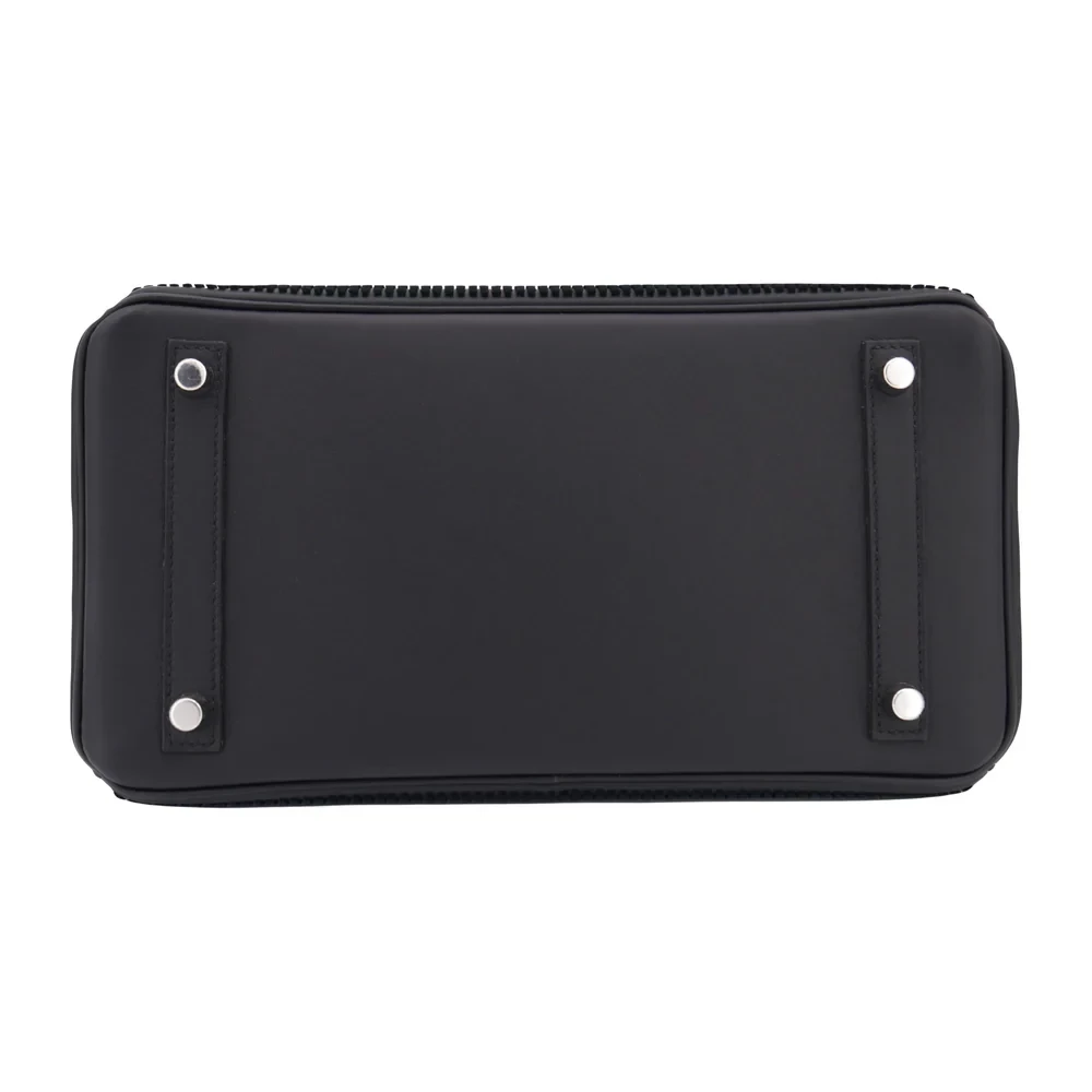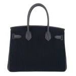 This Hermès inspired Birkin 30 uses Black Cote à Cote Tuffetage Caban Swift leather for textured edge. Palladium hardware complements the rugged 30cm design. Durable Swift leather resists scratches and stays sleek. Roomy enough for work essentials or gym gear. Pair with monochrome outfits for industrial chic. Urban toughness meets luxury.