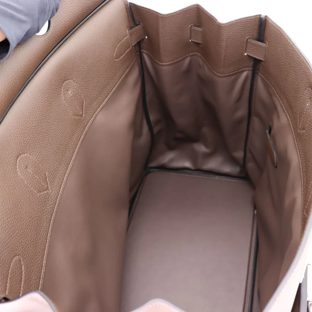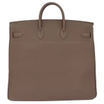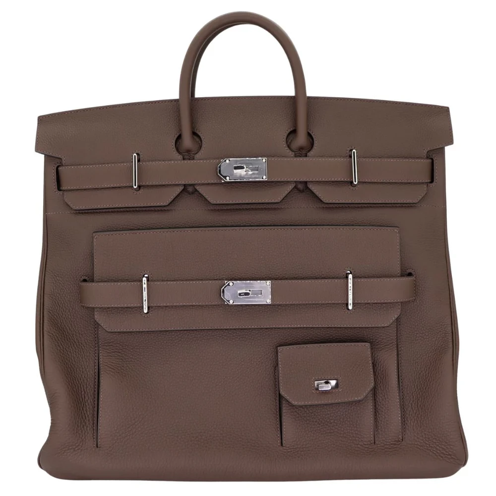This Hermès style HAC 50 uses Ecorce Togo leather in warm caramel. Palladium hardware cools the earthy tone. The 50cm design includes multiple pockets for organization. Durable leather withstands frequent travel. Pair with neutrals for organic elegance. Your perfect companion for extended journeys. Rugged functionality meets luxury.