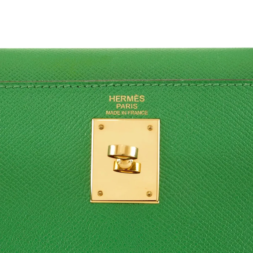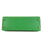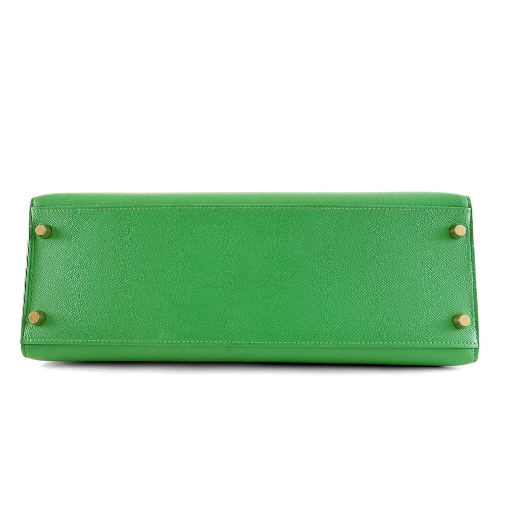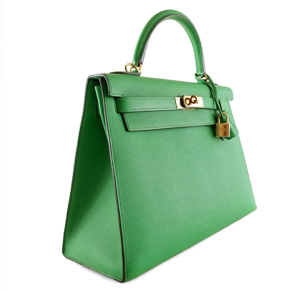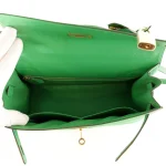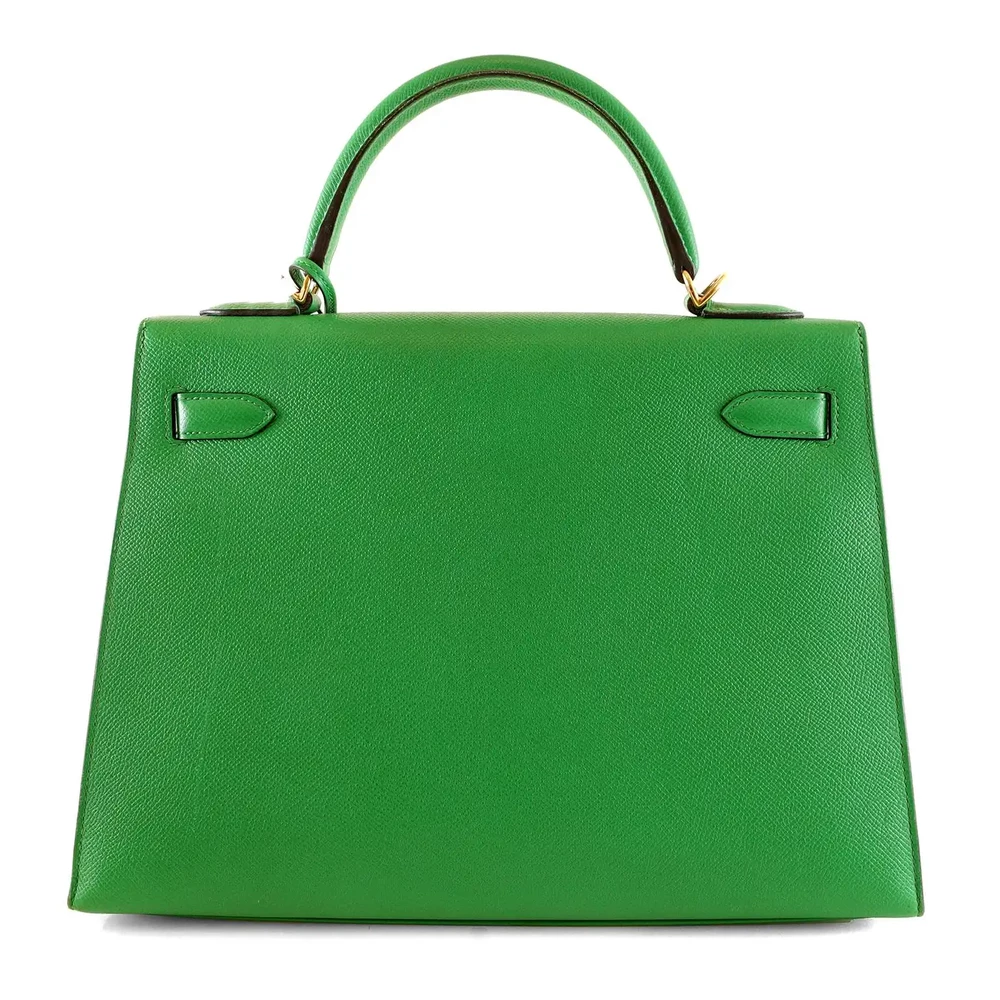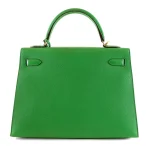 This Hermès inspired Kelly 32 glows in Bambou Togo leather for fresh, grassy green energy. Gold hardware accents the relaxed, slouchy shape. The 32cm spacious interior fits gym gear, books, and snacks. Togo leather hides minor scuffs and stays supple. Pair with neutrals or florals for spring vibes. Ideal for parks, travel, or casual outings. Vibrant versatility.