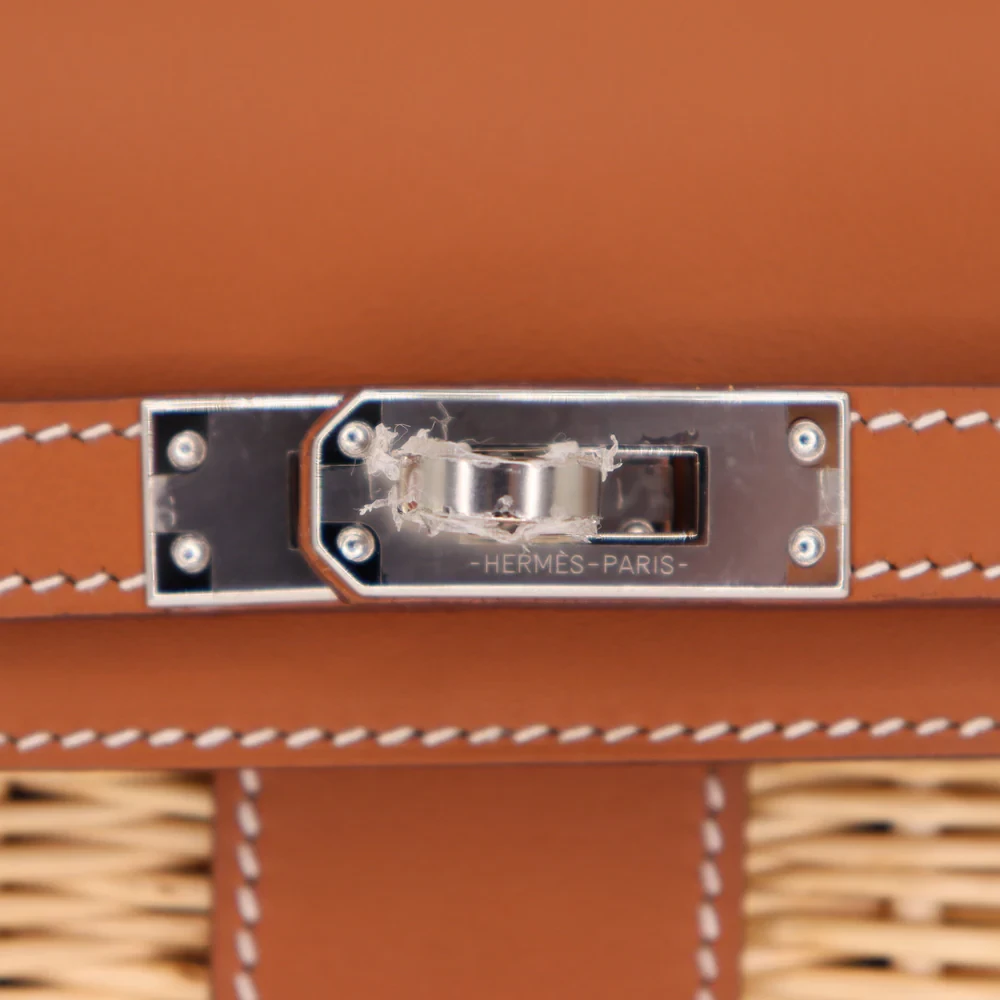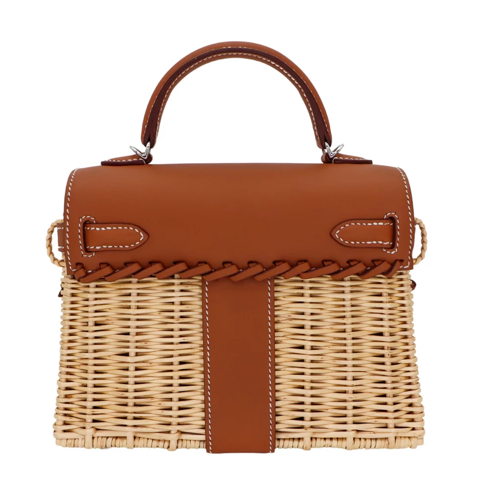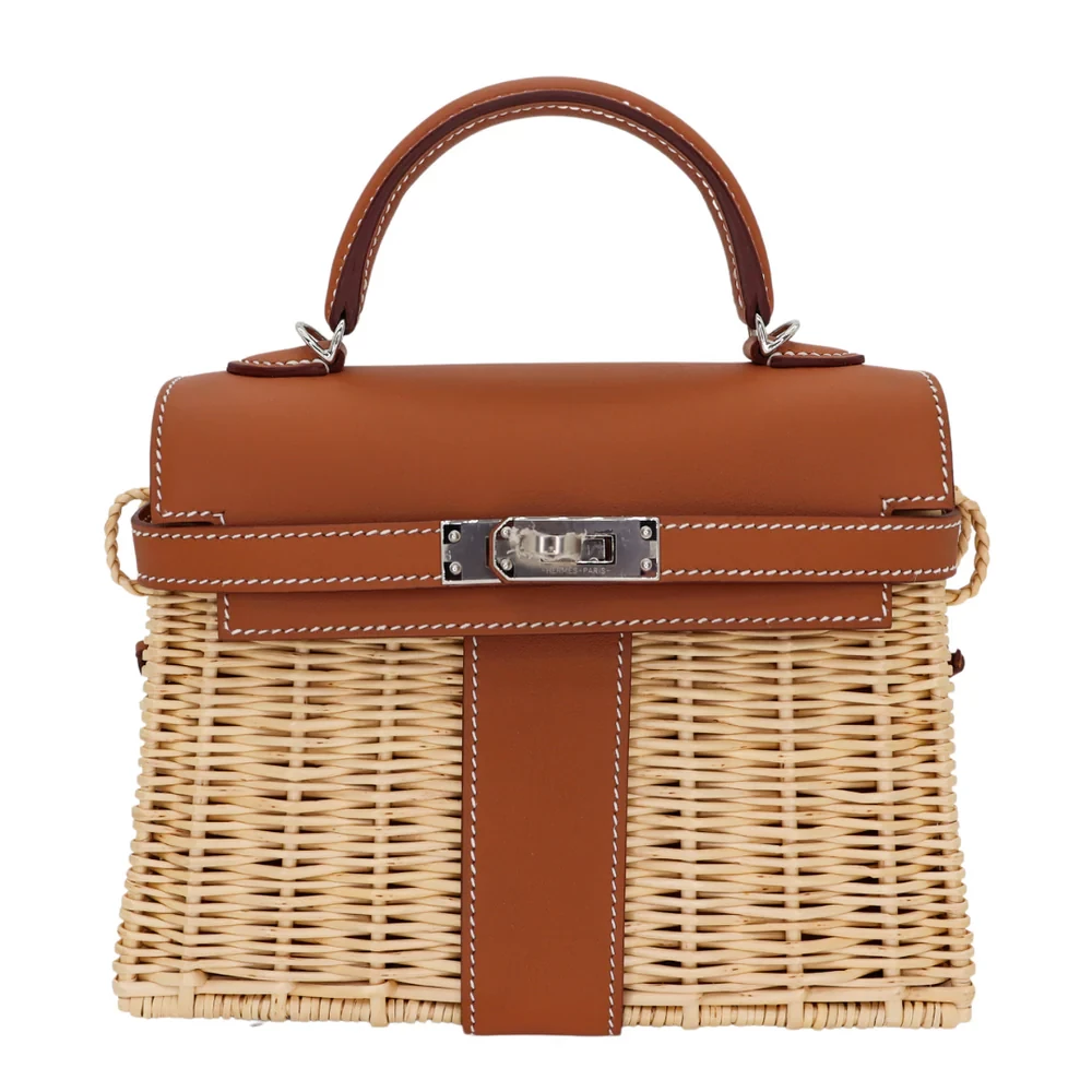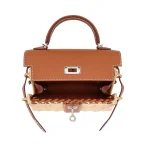 This Hermès style Kelly Mini combines Gold Swift leather. Palladium hardware adds subtle contrast. The 20cm Picnic design evokes rustic charm. Durable leather ages beautifully. Perfect for garden parties or brunches. Whimsical luxury for sunny occasions.