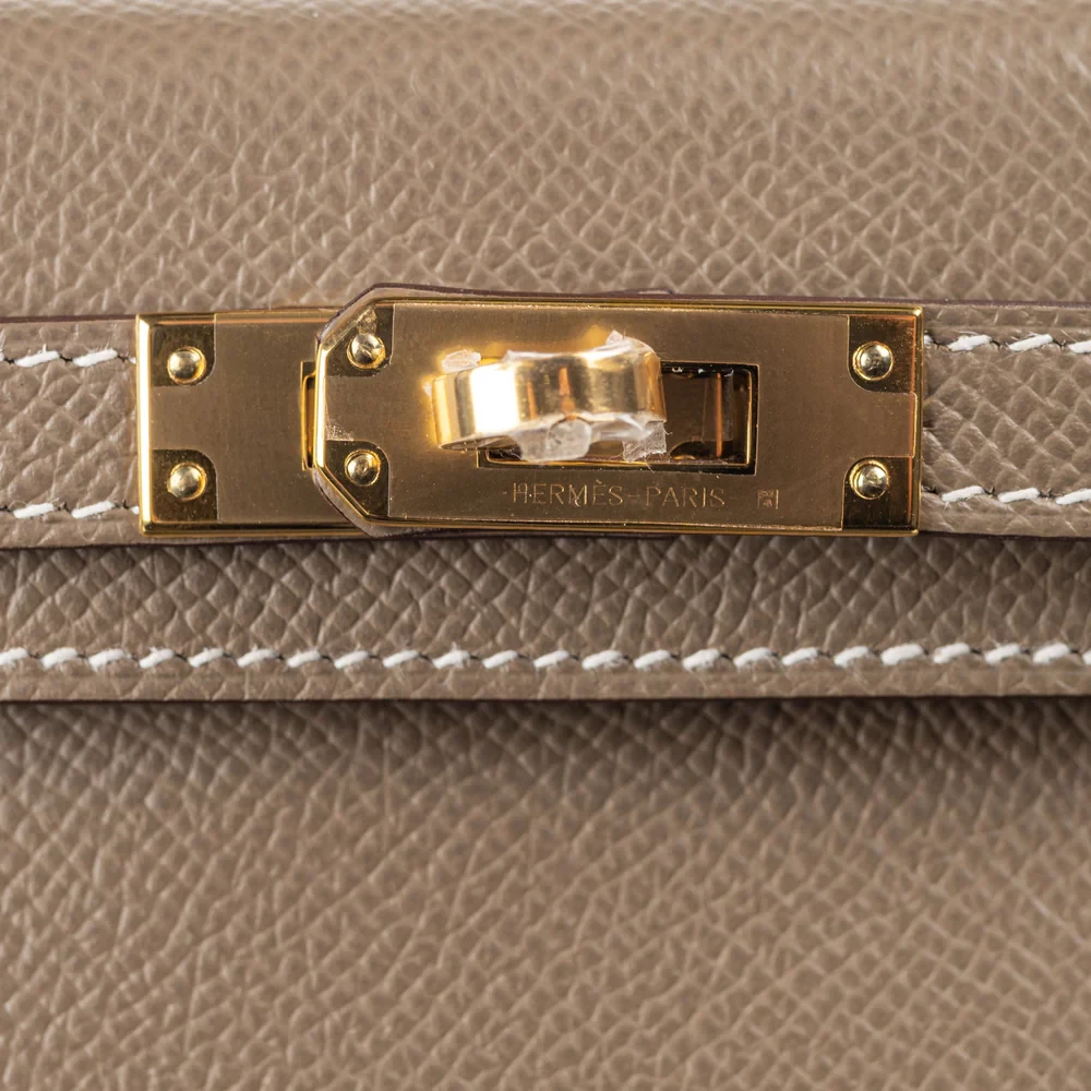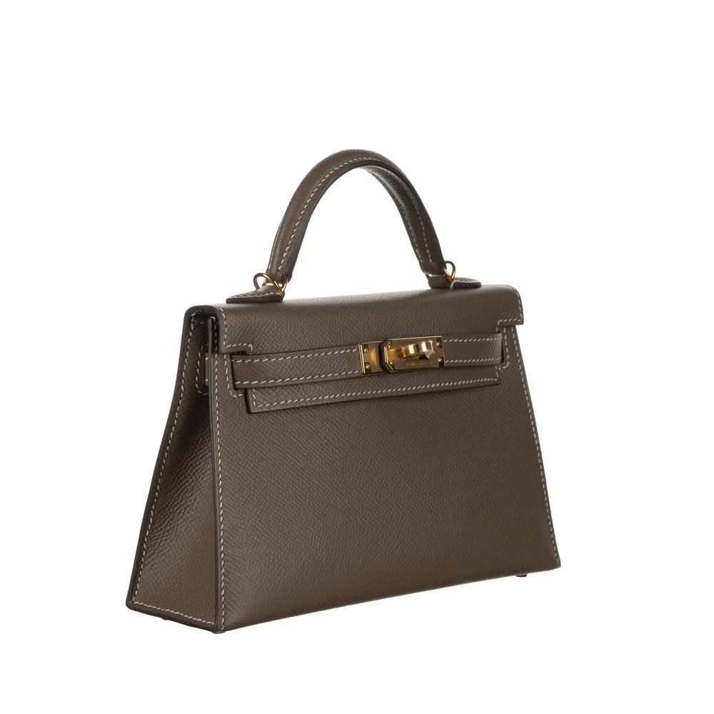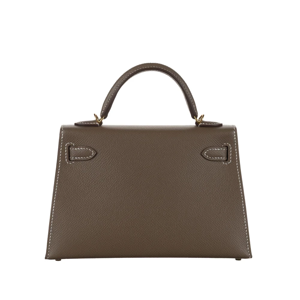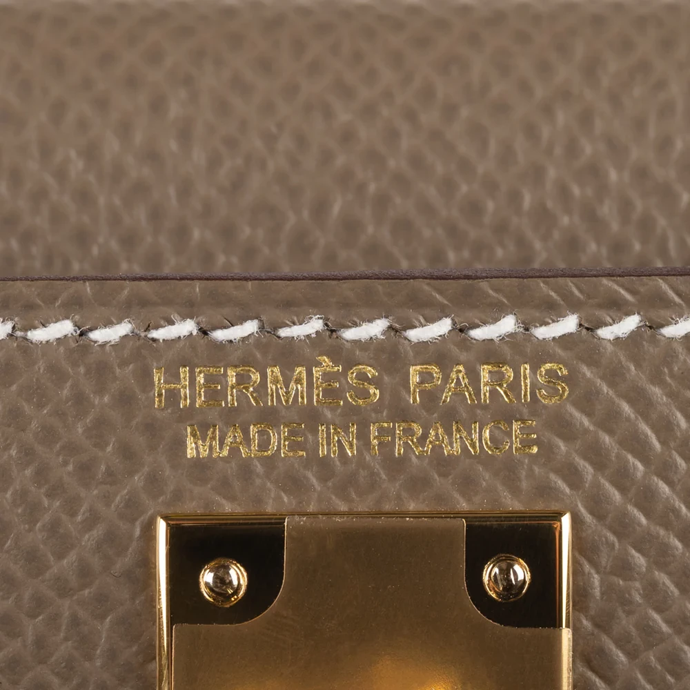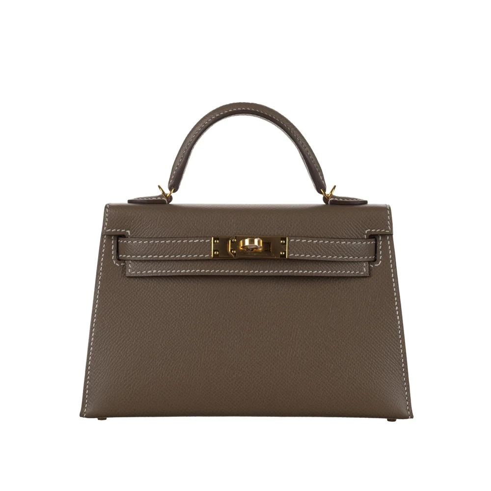 This Hermès style Kelly Mini uses Etoupe Epsom in grey brown. Gold hardware adds warmth to the neutral tone. The 20cm sellier design holds essentials securely. Scratch resistant leather stays pristine. Perfect with casual or professional outfits. Your versatile companion for day to night wear. Petite luxury with quiet sophistication.