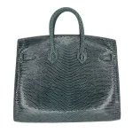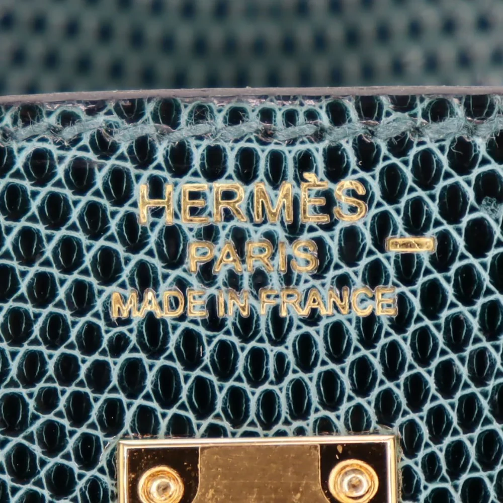 This Hermès style Birkin 20 Sellier glows in Vert Cypress shiny lizard leather, a forest green jewel tone. Gold hardware elevates the compact 20cm design. Lizard skin resists scratches and feels opulent. Fits essentials like lipstick and cards. Pair with earth tones for organic elegance. Perfect for dinners or garden parties. Nature’s luxury redefined.