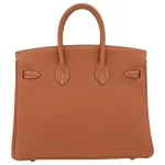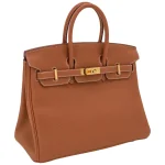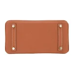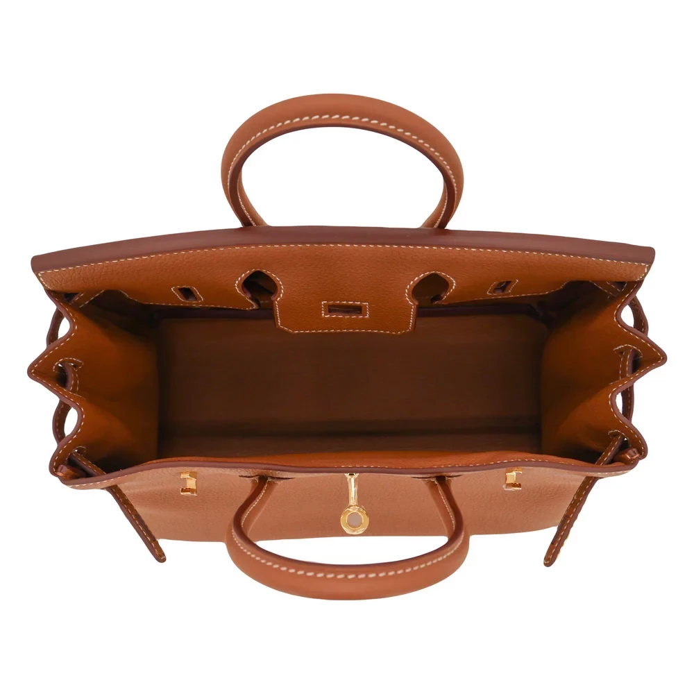 This Hermès style Birkin 25 shines in Gold Togo leather, a warm caramel gold tone. Gold hardware amplifies the 25cm design’s luxurious glow. Soft Togo leather resists scratches and ages gracefully. Compact yet fits essentials like cards and keys. Pair with neutrals or jewel tones for versatility. Timeless elegance for day or night.