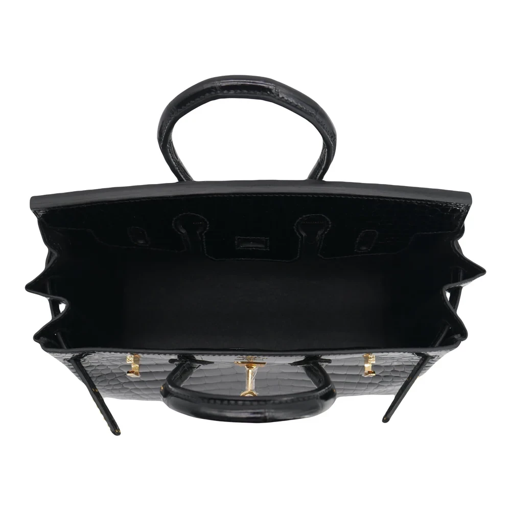 This Hermès style Birkin 25 features Black shiny Porosus crocodile leather for liquid night glamour. Gold hardware contrasts the glossy 25cm design. Scratch resistant crocodile stays pristine and eye catching. Compact yet fits essentials like keys and cards. Pair with metallics or neutrals for sleek contrast. Perfect for gala nights or boardrooms. Edgy elegance perfected.