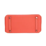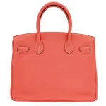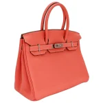 This Hermès style Birkin 30 features Crevette Clemence leather, a soft coral pink hue. Palladium hardware complements the warm undertones for understated elegance. The 30cm size holds tablets, makeup, and daily essentials with ease. Supple Clemence leather ages gracefully, developing a unique patina. Pair with neutrals or pastels for springtime charm. Lightweight and versatile for everyday adventures. Delicate yet durable sophistication.