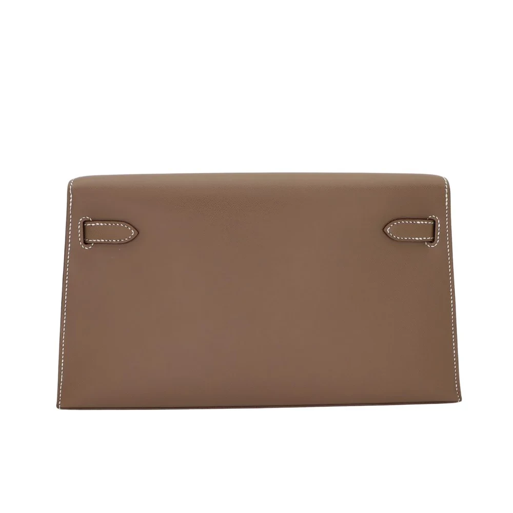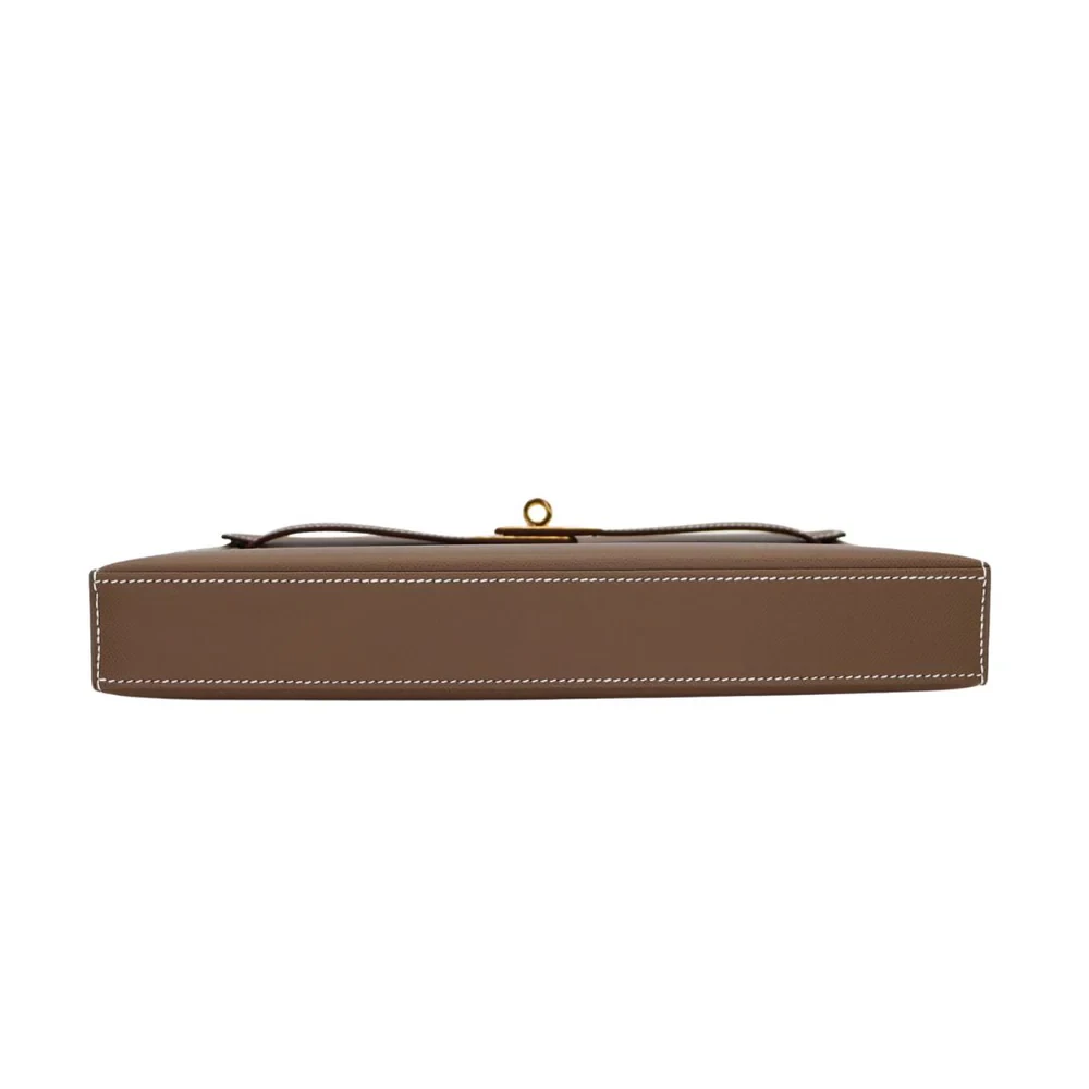 This Hermès inspired Kelly Elan uses Étoupe Epsom leather for streamlined, modern minimalism. Gold hardware outlines the bag’s sleek curves and angular flap. The 25cm size fits tablets, planners, and daily essentials. Epsom leather stays scratch resistant and rigid. Pair with monochromes or metallics for futuristic flair. Ideal for tech hubs, offices, or urban exploration. Effortless edge, engineered.