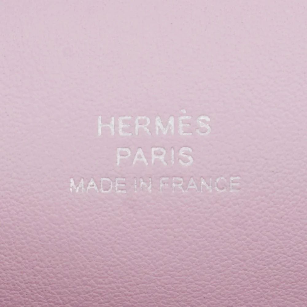 This Hermès style Kelly Pochette uses Mauve Pale Swift leather. Palladium hardware cools the soft lilac grey hue. The 18cm clutch fits cards, cash, and lipstick. Smooth leather stays pristine with minimal care. Pairs with silver jewelry for evening glamour. Ideal for weddings or cocktail parties. Subtle luxury for understated elegance.