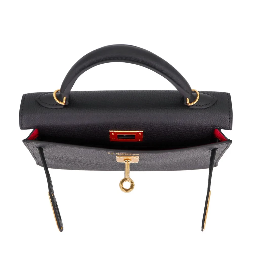 This Hermès inspired Kelly II Sellier Mini dazzles in Black and Rose Extreme Chèvre leather. Gold hardware accents the HSS contrast and Sellier angles. The mini design holds lipsticks, keys, and cards. Chèvre leather stays vibrant and scratch resistant. Style with leather jackets or evening wear for daring pop. Built for parties, festivals, or fearless fashion. Electric contrast, perfected.