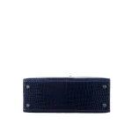This Hermès inspired Kelly 25 Sellier features Bleu Indigo Shiny Niloticus crocodile leather for deep, jewel toned texture. Diamond embedded hardware elevates the Sellier lines and clasp. The 25cm size fits laptops, cosmetics, and essentials. Niloticus crocodile is durable and weather resistant. Pair with navy suits or silver accents for regal flair. Built for red carpets or VIP events. Extravagance perfected.